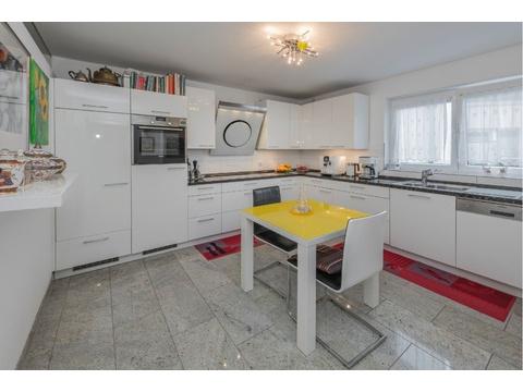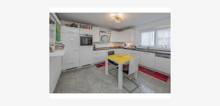Eine moderne Einbauküche mit hochwertigen Markengeräten kann nach Absprache übernommen werden und wird stilvoll durch einen edlen White-Kashmir-Granitboden ergänzt.