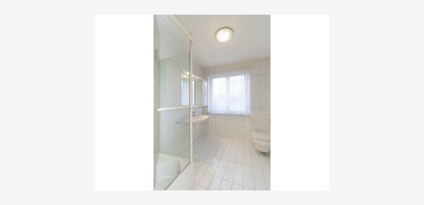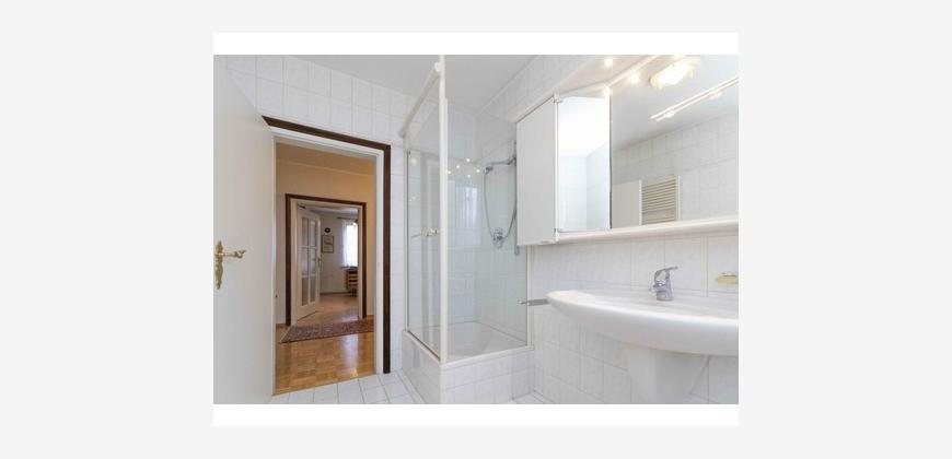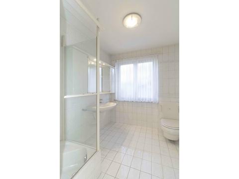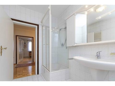 Die separate Einbauküche ist funktional gestaltet und befindet sich in einem gepflegten, älteren Zustand. Das geflieste Badezimmer ist mit einer Dusche, einem WC sowie einem großen Fenster ausgestattet.