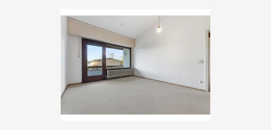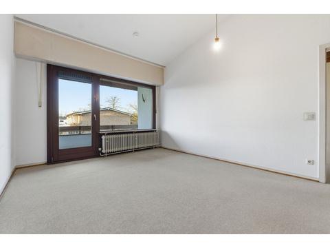 Im Obergeschoss befinden sich drei gut proportionierte Zimmer, die als Schlaf-, Kinder- oder Arbeitsräume genutzt werden können. Das dortige Badezimmer verfügt über eine Badewanne und schafft einen ruhigen Rückzugsort für entspannte Momente. Eine Loggia erweitert diese Ebene und bietet einen angenehmen Blick in den Garten.
