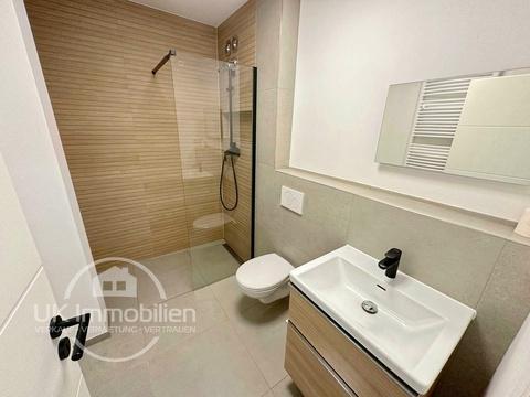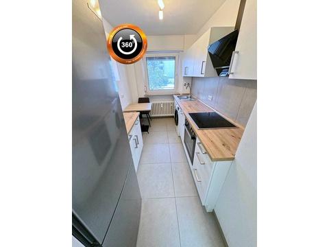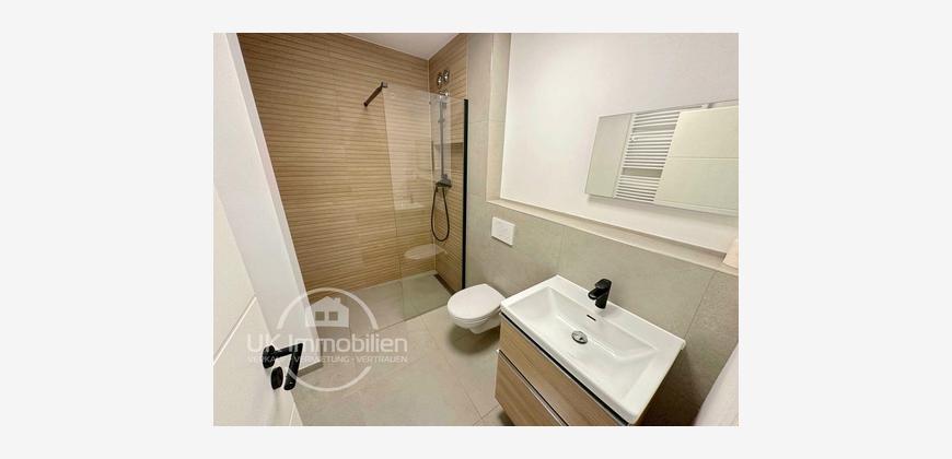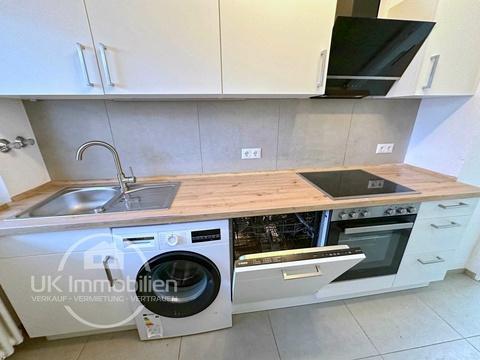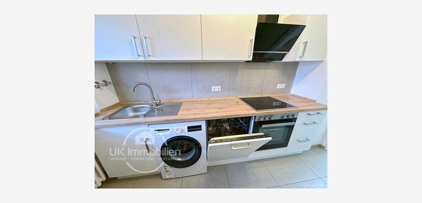 Die Wohnung wurde 2024 kernsaniert: neue Elektrik, neues Bad, neue Küche; alles aus einem Guss. Die Einbauküche setzt mit beleuchteter Arbeitsfläche und zeitgemäßen Geräten (u. a. Kühl-Gefrierkombi, Glaskochfeld, Waschmaschine) funktionale Akzente.