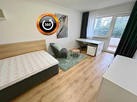 Beide Hauptzimmer sind voll möbliert; jeweils mit Bett mit Ambientebeleuchtung, Kleiderschrank, Kommode, Schreibtisch mit Drehstuhl, Sitz-Rollcontainer, Regalen, Beleuchtung und Gardinen. Moderne, weiße Türen und ein durchdachtes Lichtkonzept sorgen für ruhige, zeitlose Eleganz.