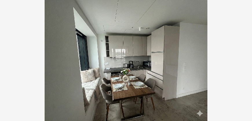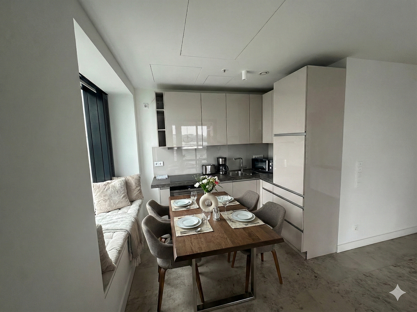Dieses Apartment wird höchsten Ansprüchen an Design und Funktionalität gerecht und präsentiert sich in einem absolut neuwertigen Zustand (Baujahr 2018). Das Herzstück bildet der lichtdurchflutete Wohnbereich mit offener, maßgefertigter Einbauküche (inklusive hochwertiger Elektrogeräte) und direktem Zugang zur verglasten Loggia, die den Wohnraum nahtlos zum Süd-West-Balkon erweitert.