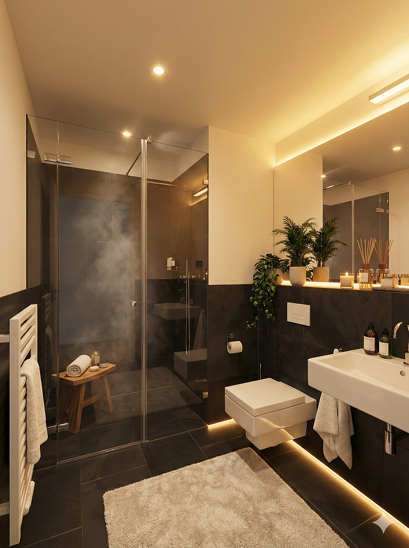 Technisch ist die Residenz State-of-the-Art: Eine Fußbodenheizung (gespeist durch nachhaltige Erdwärme) sorgt für ein angenehmes Raumklima, während der Glasfaseranschluss High-Speed-Internet garantiert. Das innenliegende Luxus-Badezimmer besticht durch eine großzügige, ebenerdige Dusche und hochwertige Armaturen.