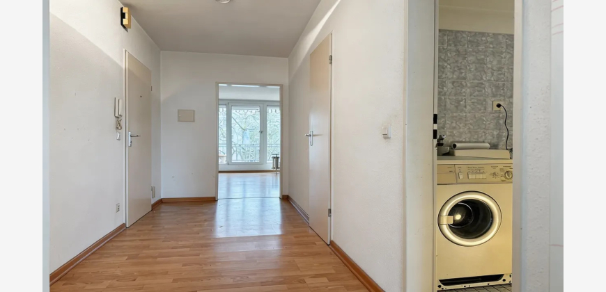 Schon beim Eintreten empfängt Sie eine zentrale Diele, von der aus alle Räume gut erreichbar sind. Der Wohnbereich wirkt freundlich und einladend und bietet ausreichend Platz für eine gemütliche Sofaecke sowie einen kleinen Essbereich. Von hier aus gelangen Sie auf den von der Straße abgewandten Balkon mit Blick ins Grüne. Ein schöner Rückzugsort für den ersten Kaffee am Morgen oder einen entspannten Feierabend mit angenehmer Ruhe.