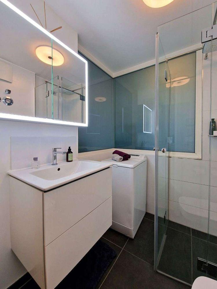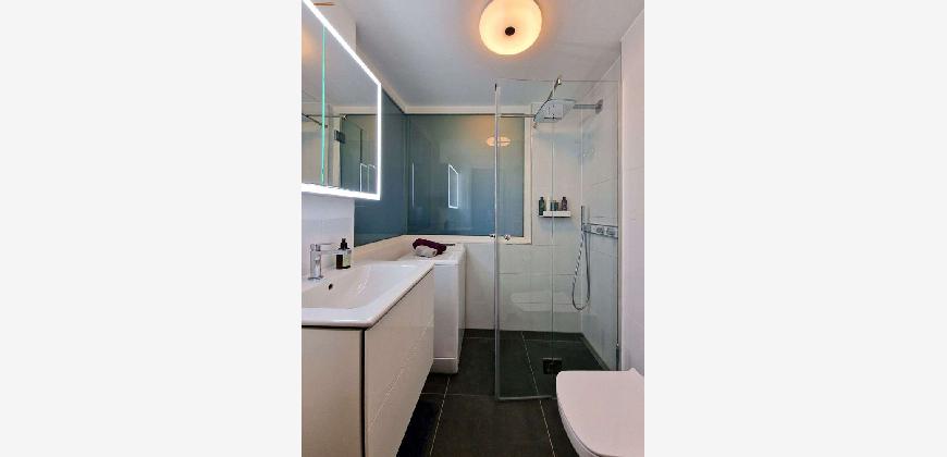 Das Bad ist ebenso modern gestaltet, mit feinen hellen Wand- und Bodenfliesen, ausgestattet mit Dusche, Badschränken sowie Waschmaschine.