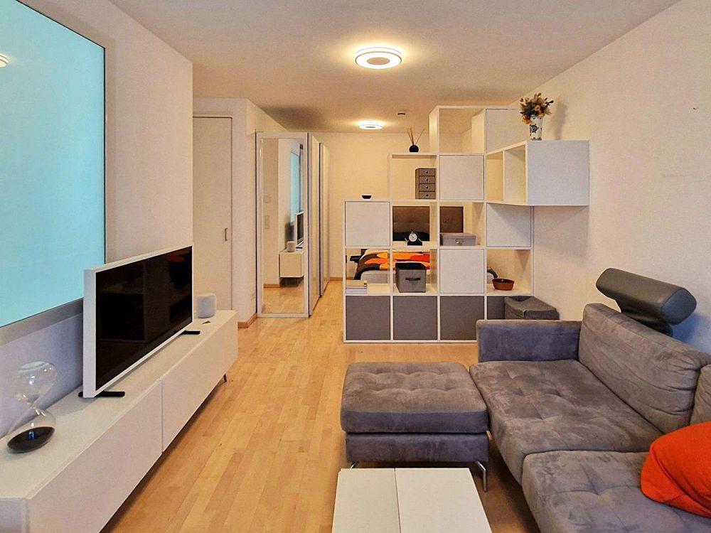 Die gesamte Einrichtung ist hochwertig und geschmackvoll abgestimmt. Der Wohn- und Schlafraum ist sehr ansprechend möbliert, dazu gehören u. a. ein Bett in Komfortbreite, ein modernes Sofa mit Couchtisch, ein großes Raumteiler-Regal, Stühle, Lampen, Vorhänge etc. Ein Kleiderschrank und ein Garderobenschrank bieten Platz für Kleidung und Vieles mehr. Der weiße Multifunktionstisch ist variabel als Ess- und als Schreibtisch nutzbar. Zudem gehört ein Flatscreen-TV mit zum Equipment.
