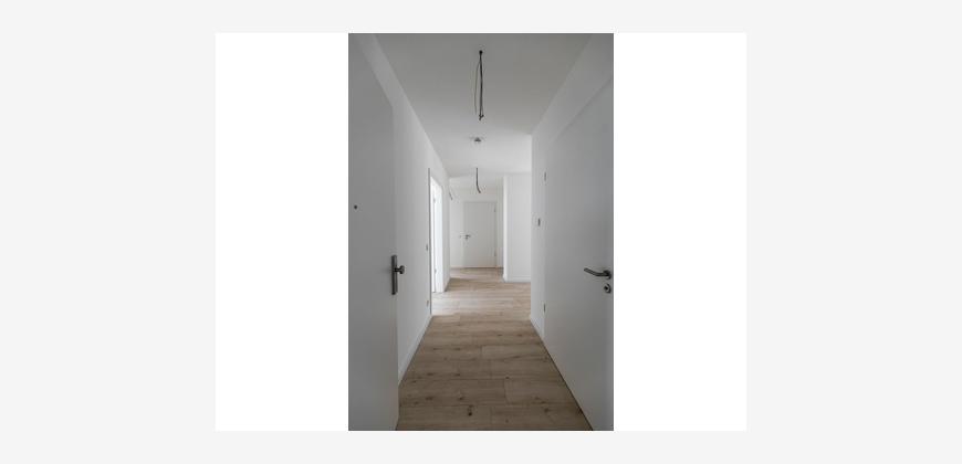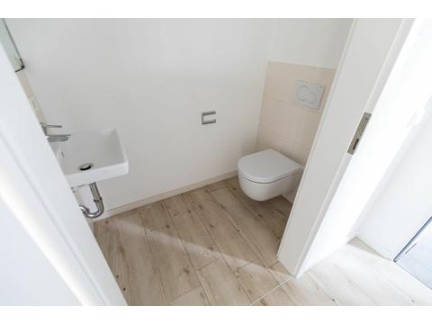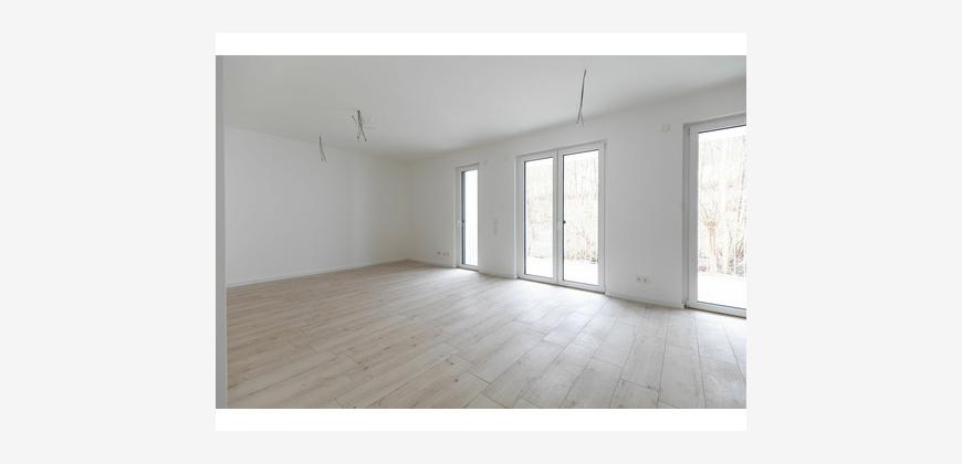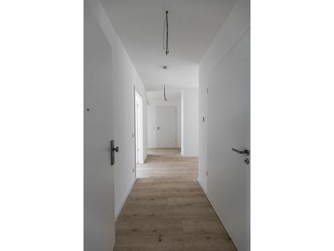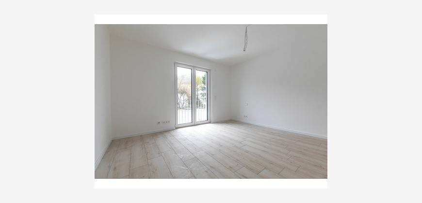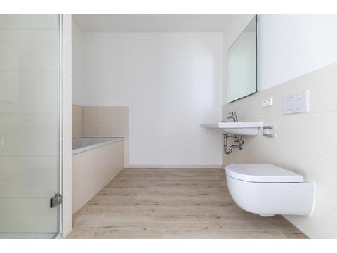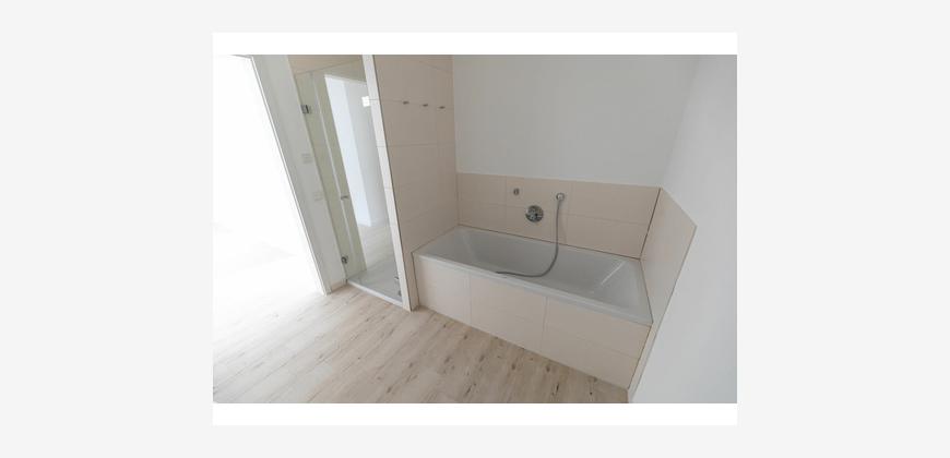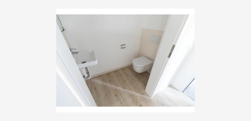 Die Wohnung im 1.OG besteht aus einer großen offenen Wohnküche mit Essbereich, zwei Schlafzimmern, einem innenliegenden Bad mit Badewanne, begehbarer Dusche und einem separaten Gäste-WC.