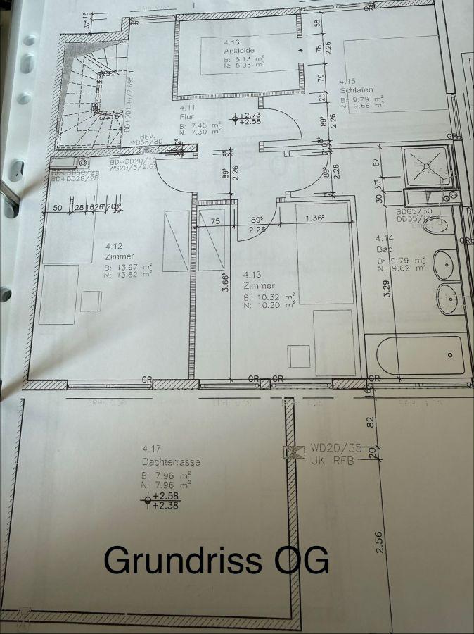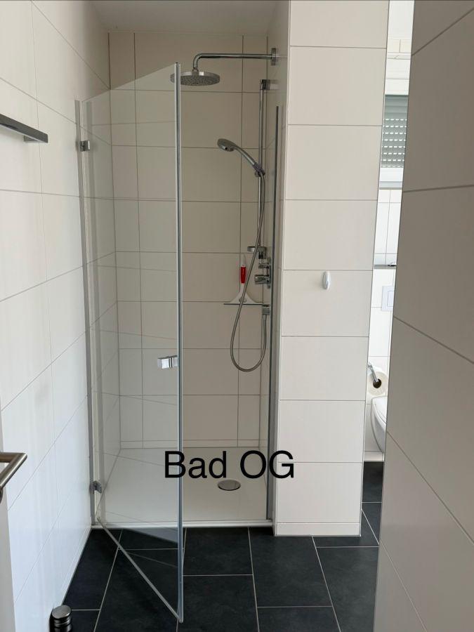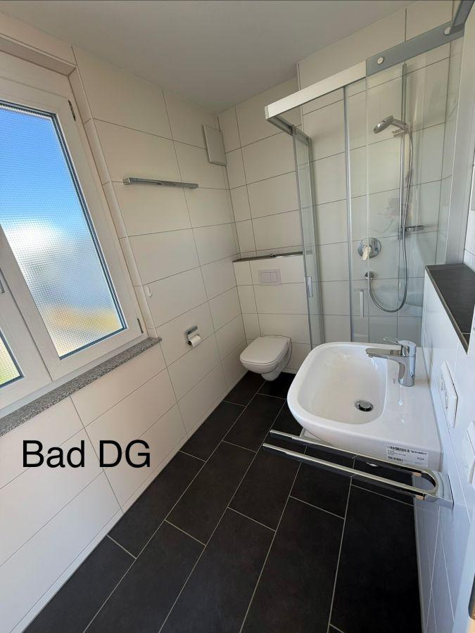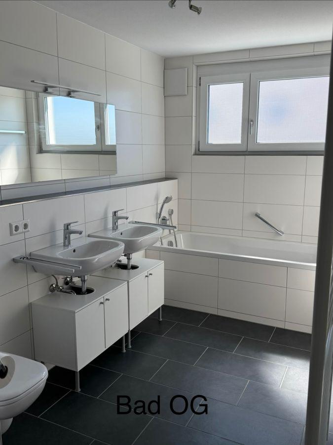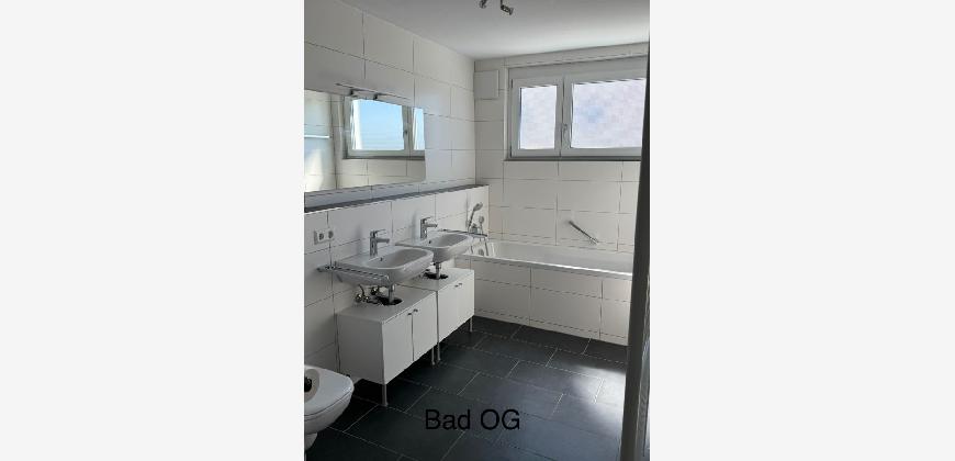 - Tageslichtbad im OG mit Doppelwaschbecken, Handtuchheizkörper, Dusche, WC, Badewanne