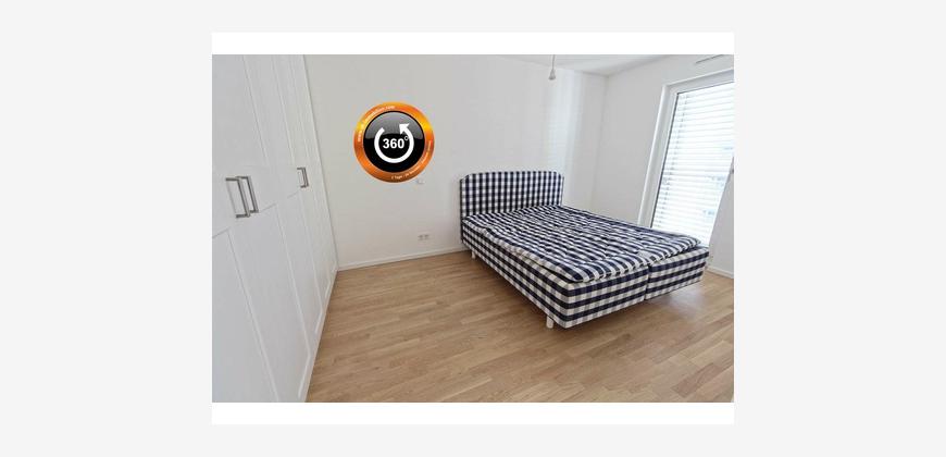 Sie leben bequem auf rund 71 m² Wohnfläche – diese wurde vom Architekten sehr geschickt verteilt. Das Wohnzimmer bietet eine klare Aufteilung, sehr hell durch bodentiefe Fenster. Schaut man aus dem Fenster, liegt die beeindruckende EZB vor einem.