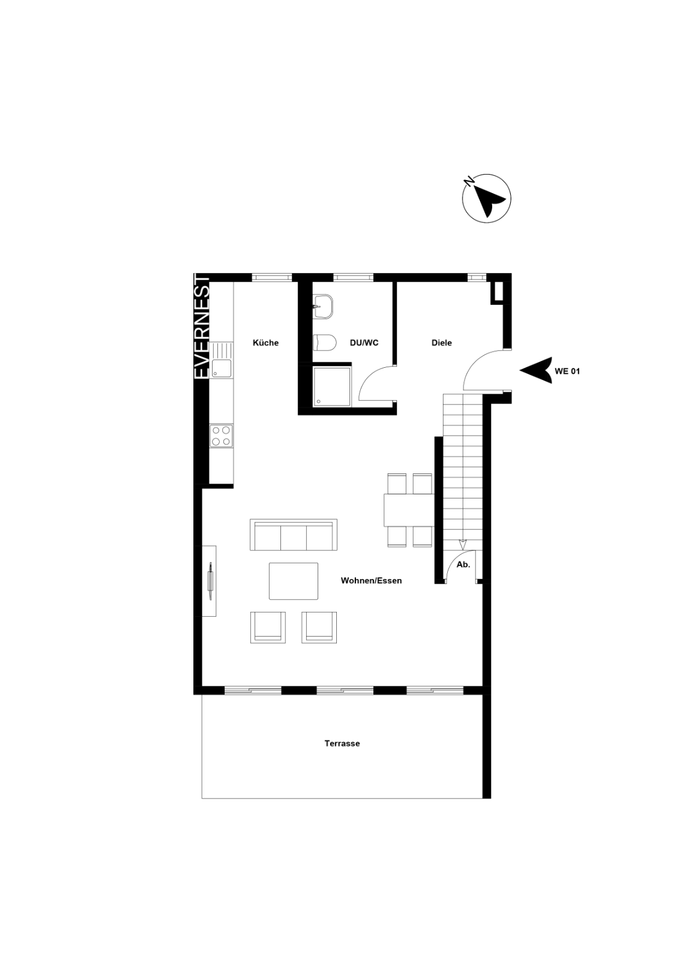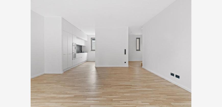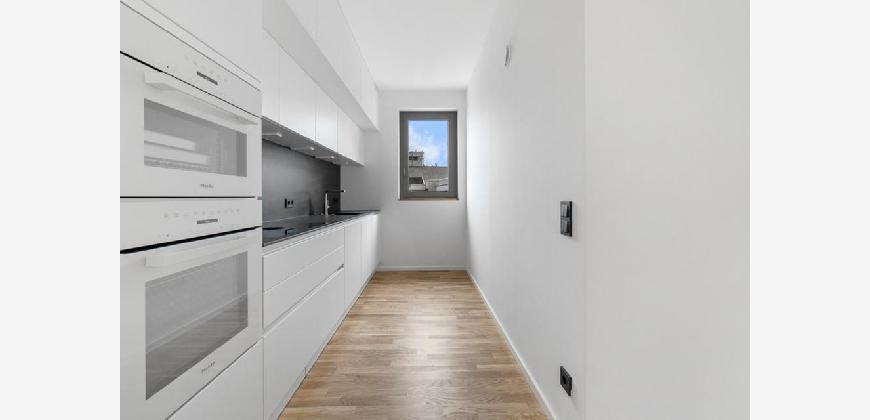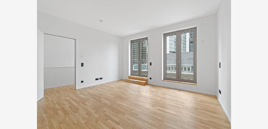 Durch das geräumige Entrée haben Sie sowohl Zugang zum großzügigen Wohn- und Essbereich mit einer hellen Küche, welche mit allen notwendigen Elektrogeräten von Miele ausgestattet ist, als auch das erste Tageslichtbad mit Dusche. Vom Wohn- und Essbereich aus haben Sie ebenfalls den Zugang auf den ca. 12 m2 großen Balkon, welcher genug Platz für eine gemütliche Lounge und atemberaubende Skyline-Atmosphäre bietet.