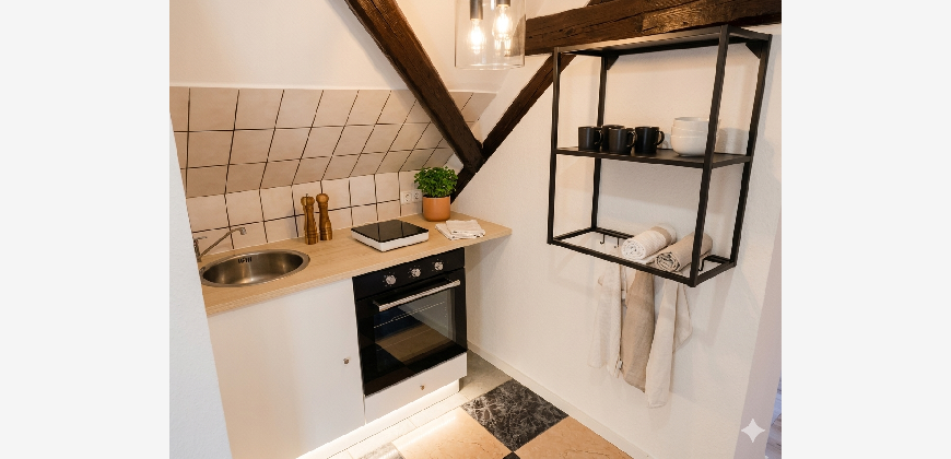 -Küche: Kompakte Miniküche mit Spülbecken, Kochfeld und Backofen – ideal integriert.