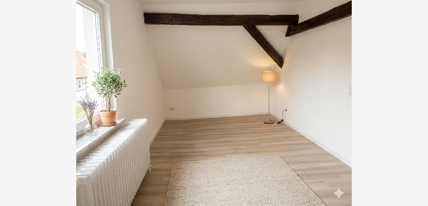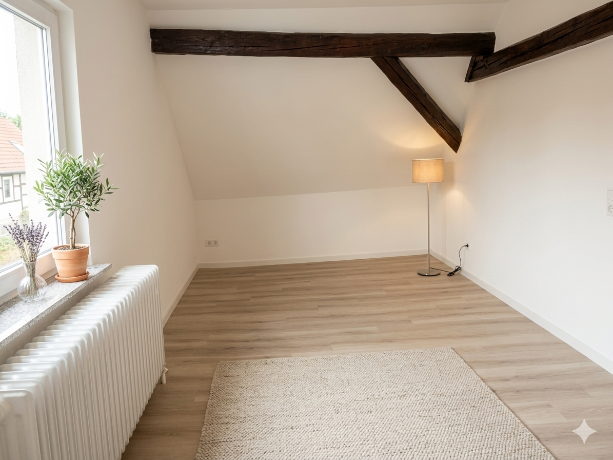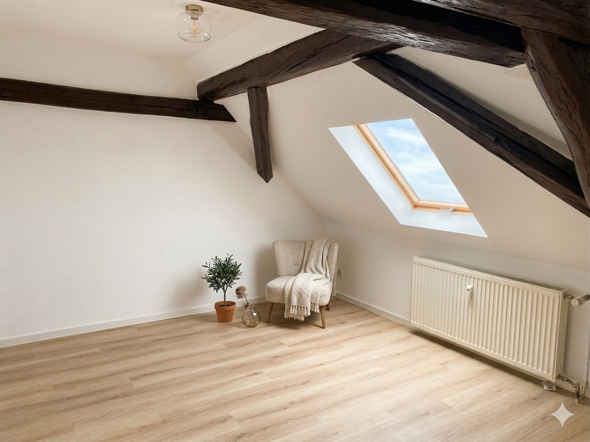 -Ambiente: Sichtbare, dunkle Echtholzbalken kombiniert mit hellem Vinylboden und frisch weiß gestrichenen Wänden.