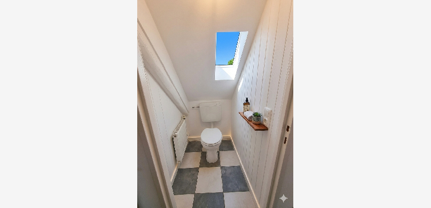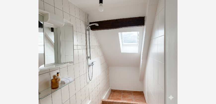 -Sanitär: Praktische Trennung von Duschraum und separatem Gäste-WC mit eigenem Fenster.