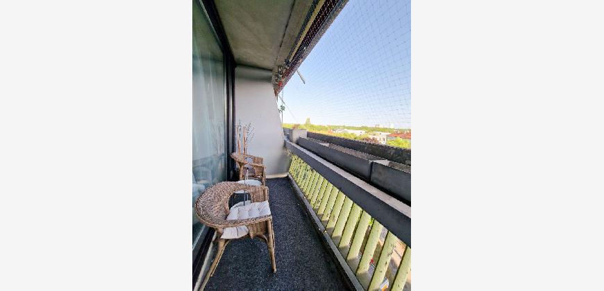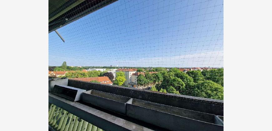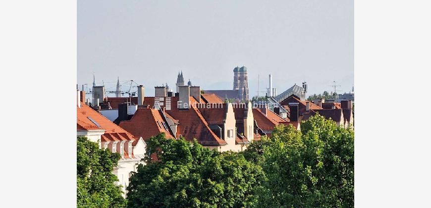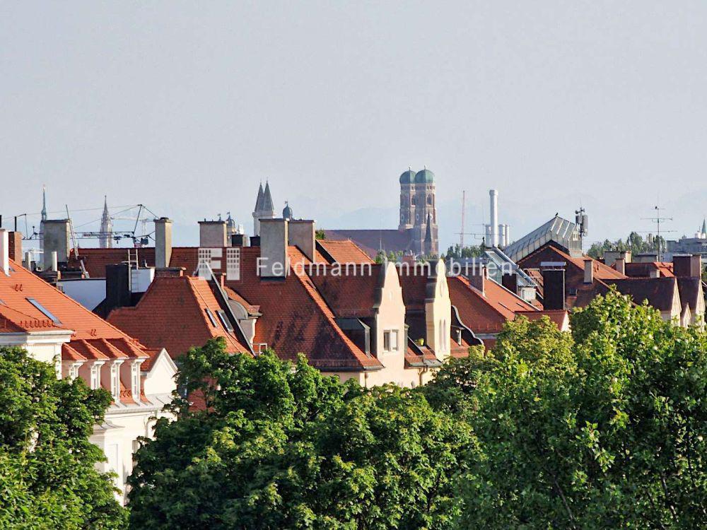 Herrlich: Durch die raumbreite, bodentiefe Fensterfront Richtung Süden und die Lage im 7. Obergeschoss wirkt das Apartment wunderbar hell. Und die Aussicht von der geschützten Loggia ist einfach grandios: mit einem Panoramablick über München, hinweg über die Türme der Frauenkirche - und bei klarer Sicht bis zu den Alpen!