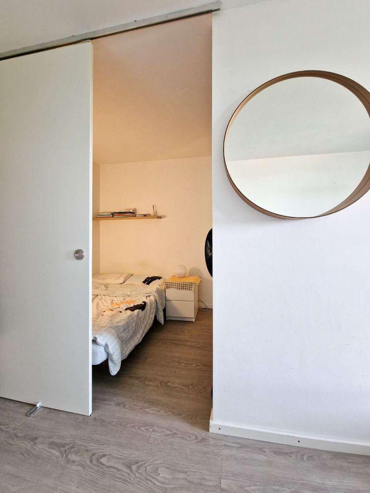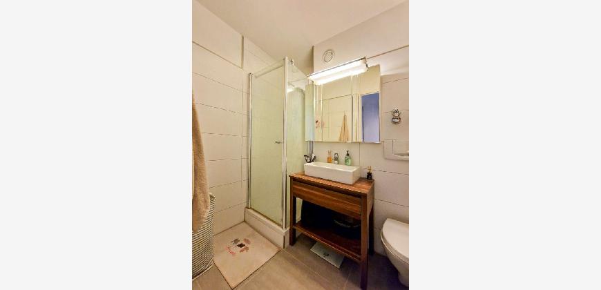 Ideal: Der lichtdurchflutete Wohnraum ist großzügig geschnitten und lässt sich sehr gut einrichten - wie man an der aktuellen Möblierung sieht. Es ist Platz genug für ein kuschlige Sofaecke, einen separaten Essplatz und ein Homeoffice mit Schreibtisch. Um den großen Raum noch angenehmer zu gestalten, wurde die Schlafnische mit Bett und Kleiderschrank durch Wände und eine Schiebetür abgetrennt. Übrigens wurde die gesamte Wohnung modernisiert. So auch das Bad, das sich mit Dusche und großformatigen hellen Fliesen sehr ansprechend und chic präsentiert.