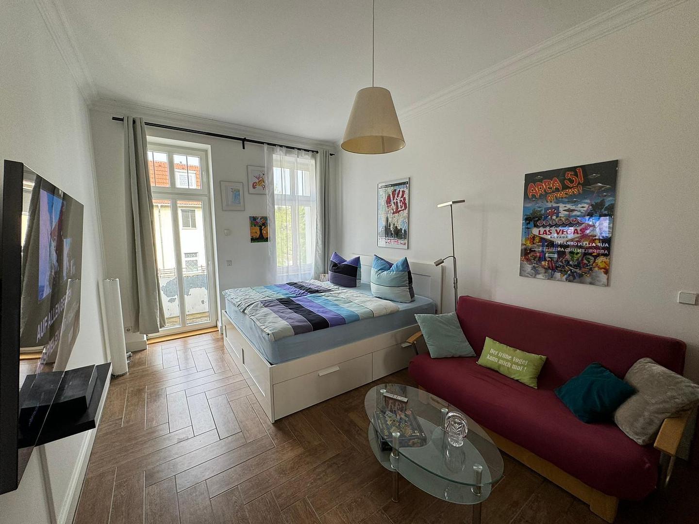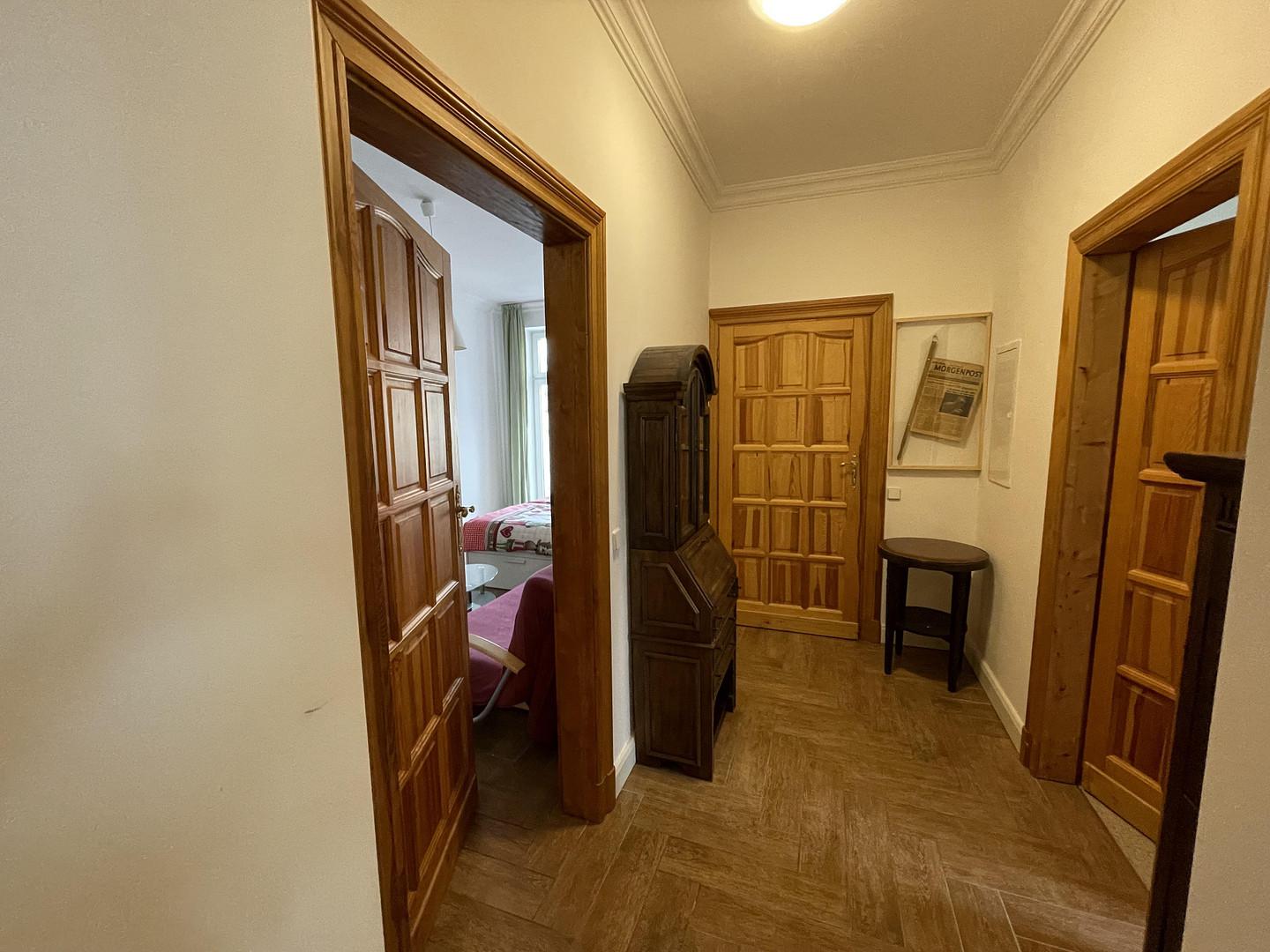 Die Wohnung liegt ruhig und dennoch zentral in Berlin-Pankow und befindet sich direkt an einem idyllischen Park mit kleinem See, der einen besonderen Erholungswert bietet. Der S-Bahnhof ist nur etwa 500 Meter entfernt und bietet mit im Zehn-Minuten-Takt fahrenden Zügen eine schnelle Verbindung in die Berliner Innenstadt. Berlin-Mitte ist in etwa 10 bis 15 Minuten erreichbar. Von dort aus lassen sich zahlreiche Sehenswürdigkeiten wie das Brandenburger Tor, der Bundestag oder der Kurfürstendamm bequem erkunden. Auch Bootsfahrten auf der Spree sind möglich. Das lebendige Viertel Friedrichshain mit seinen vielen Bars, Cafés und Clubs ist ebenfalls schnell zu erreichen. In unmittelbarer Umgebung der Wohnung befinden sich zudem kleine Cafés und Bistros, die zum Verweilen einladen.