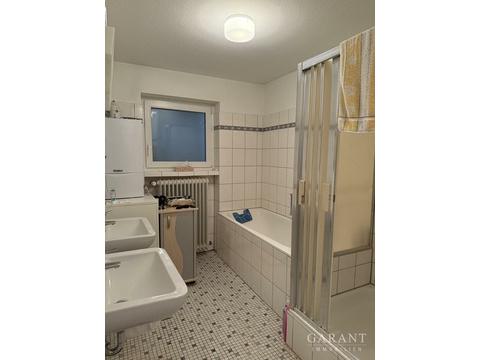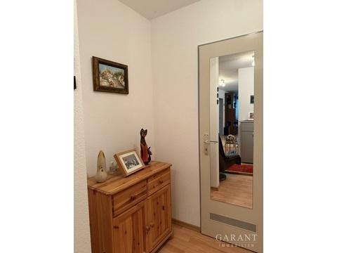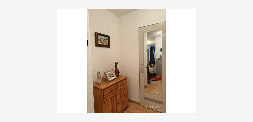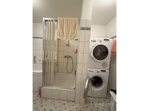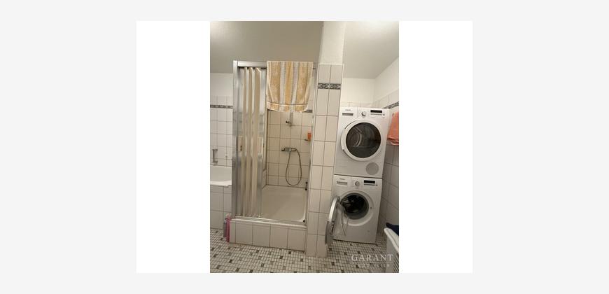 Am Eingang empfängt sie ein kleiner Flur mit Garderobe und Abstellraum. Zur Wohnung gehört ein Badezimmer mit Waschbecken, Dusche und Wanne sowie einem Anschluss für Ihre Waschmaschine. Das WC befindet sich separat nebenan.