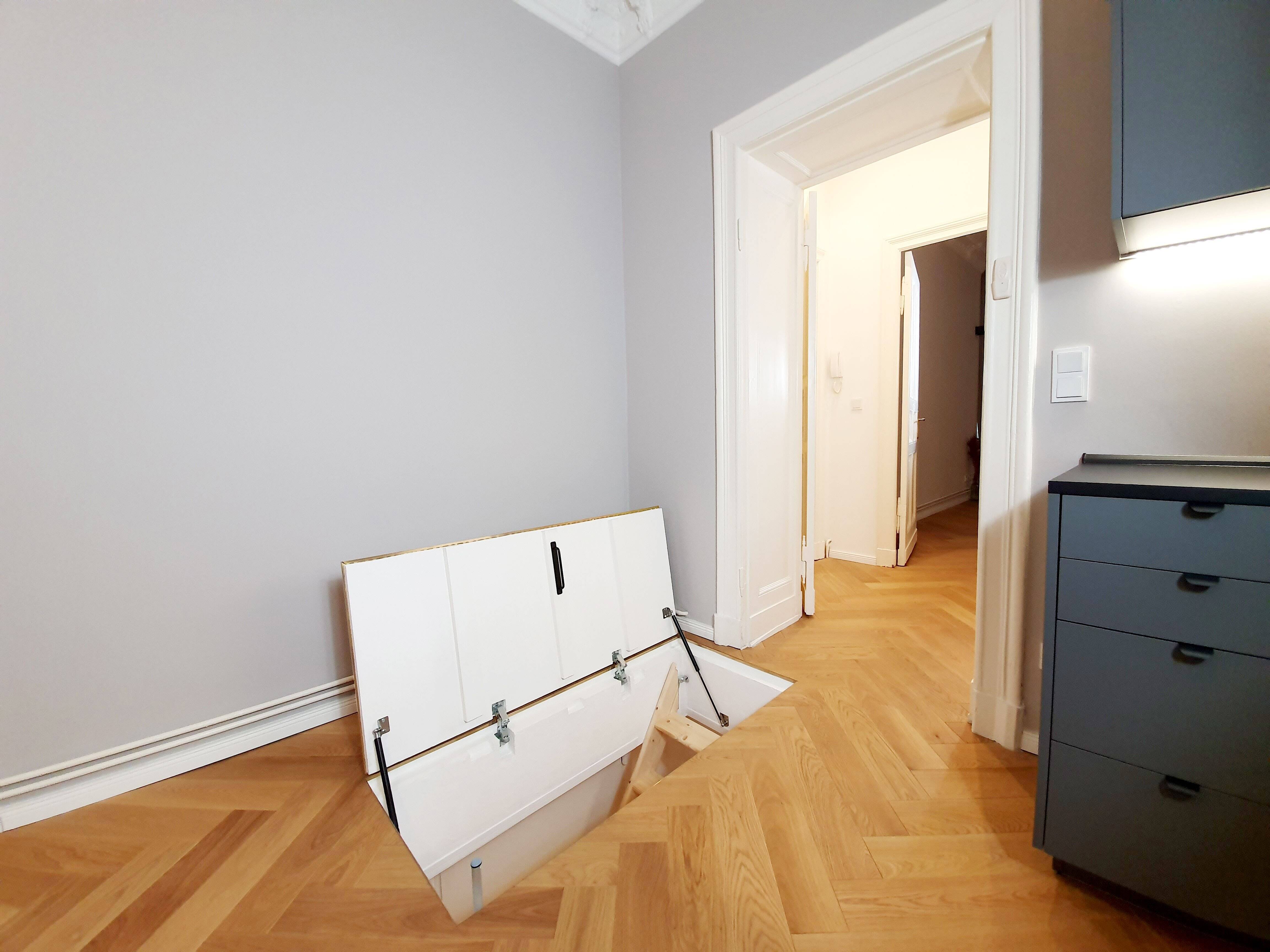 Besonders macht die Wohnung auch, dass sie neben einem Keller (ca. 6m²) zusätzlich über einen 21m² großen beheizten Hobbyraum (Deckenhöhe 1,85m) mit Fenstern verfügt, der direkt von der Wohnung aus über eine ausgeklügelte elektrische Bodenluke zu erreichen ist. Gemeinsam mit dem Hobbyraum verfügt die Wohnung über eine Nutzfläche von 107m².