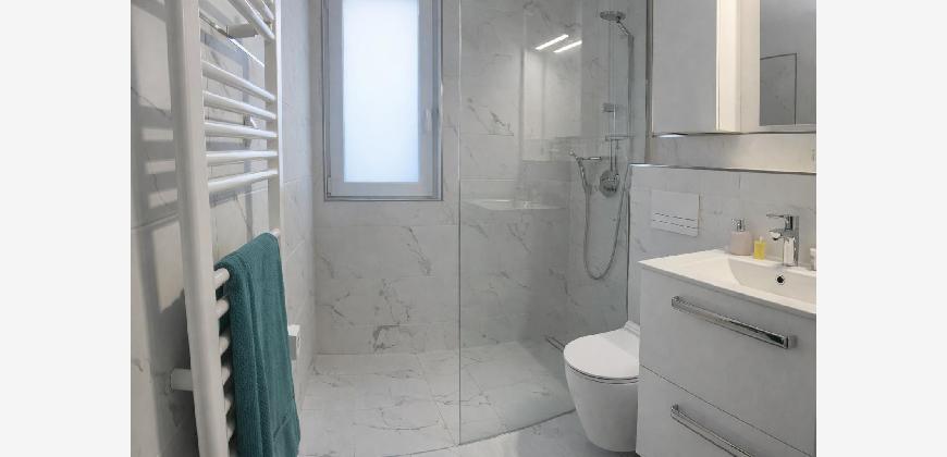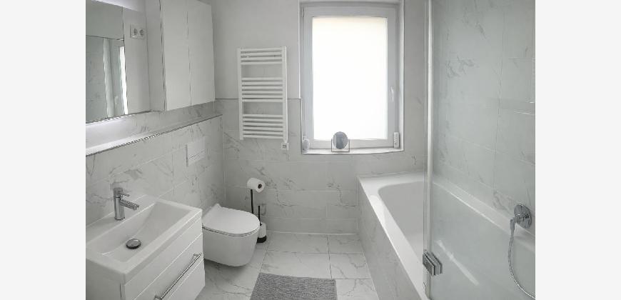 - Beide Bäder in edler Marmoroptik-Fliesen