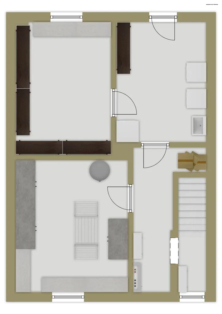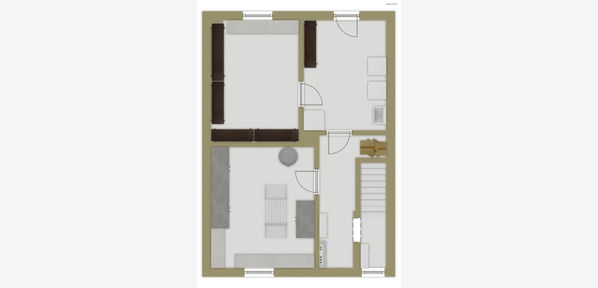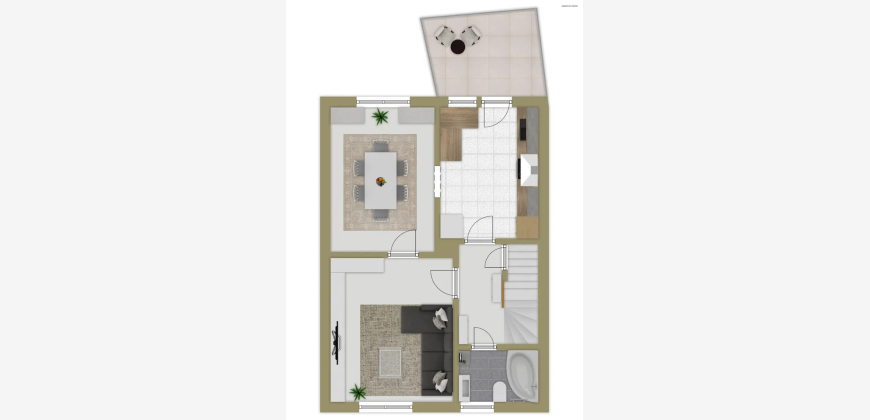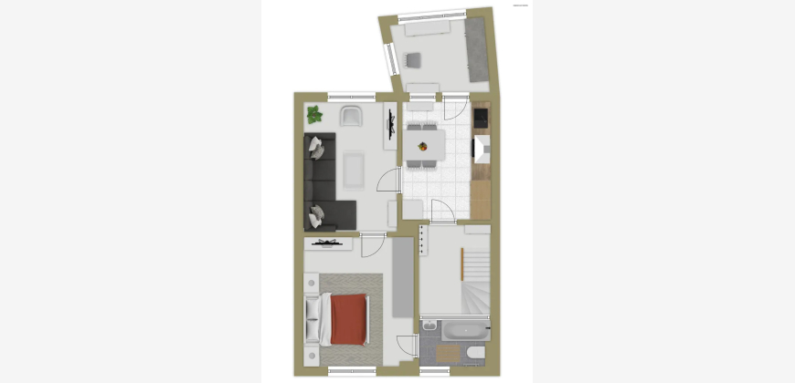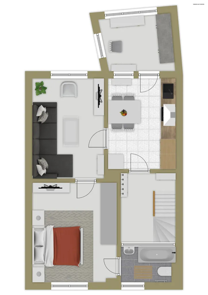 - 2. Obergeschoss (ca. 49 m²): Tageslichtbad mit Eckbadewanne, Wohn- und Essbereich, Küche, Zugang zur