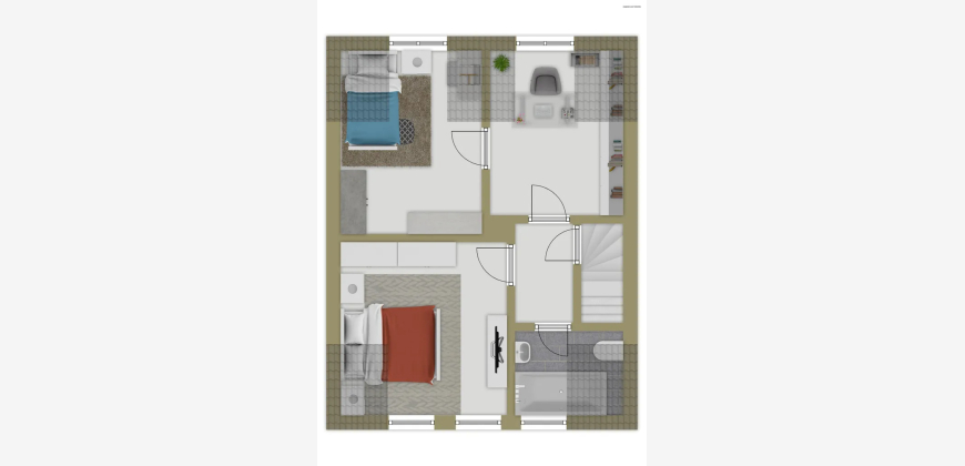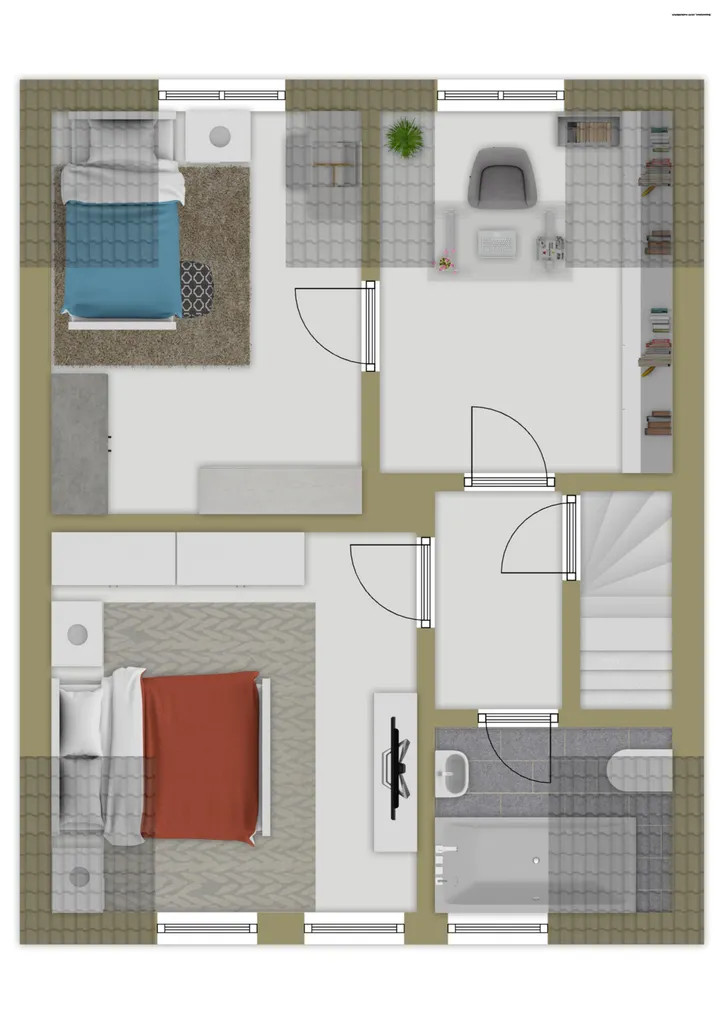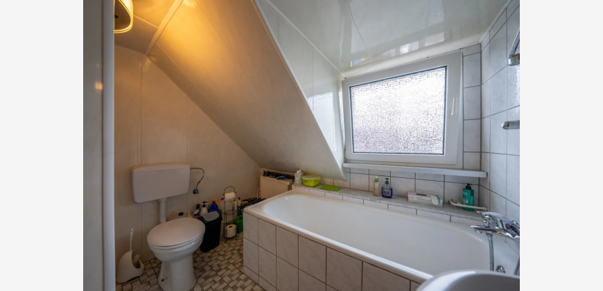 - Dachgeschoss (ca. 49 m²): Tageslichtbad mit Badewanne, 2 Schlafzimmer, Büro-/Arbeitsbereich – perfekte