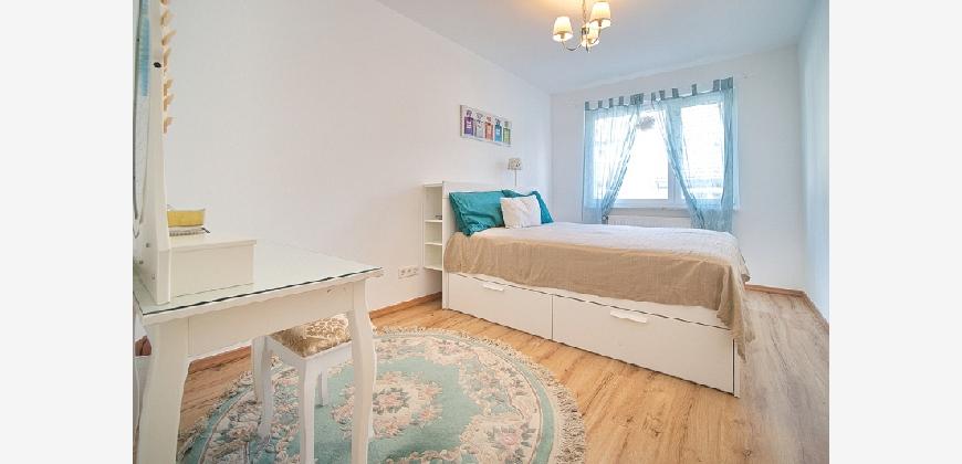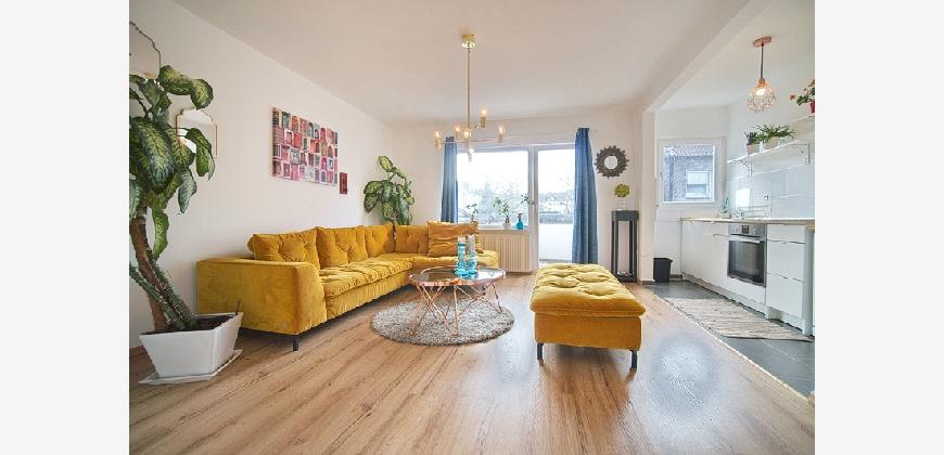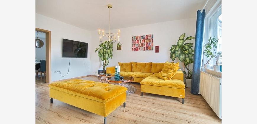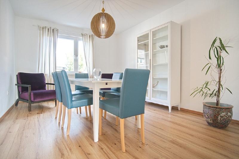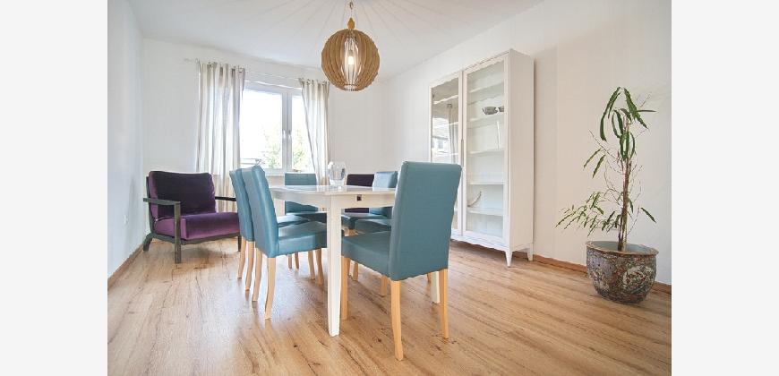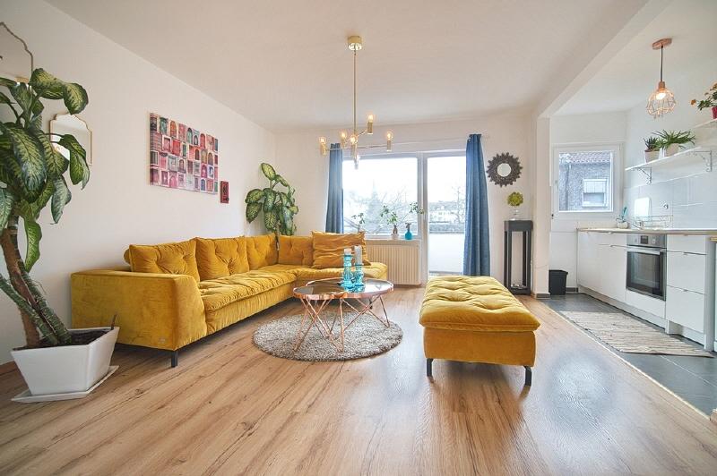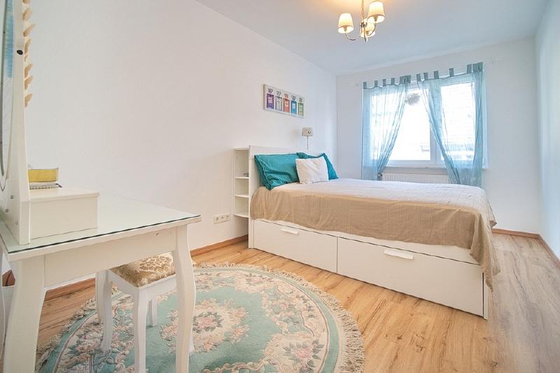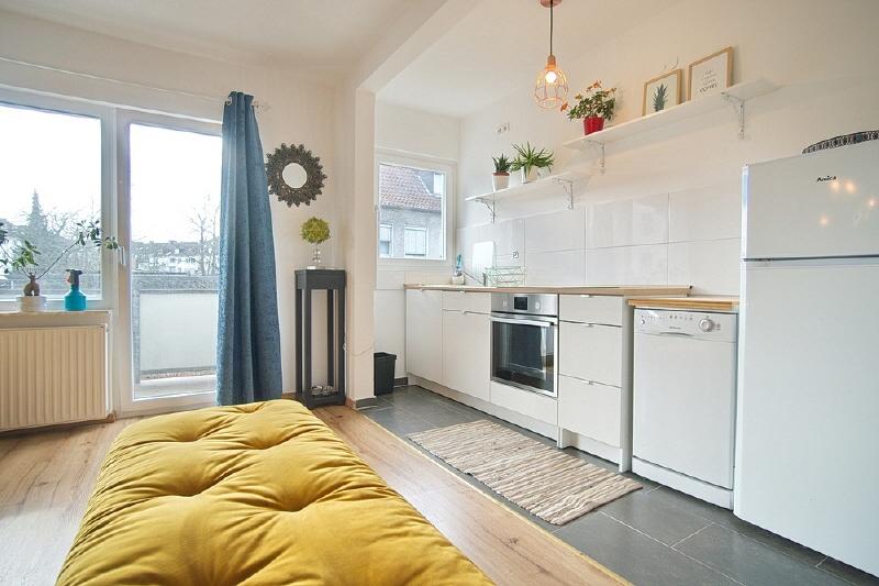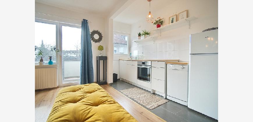 Spacious apartment in the second floor of a small multi-family building. Located in a side street near Essen’s main rail station (700 metres). The apartment is therefore extremely central, yet enjoys a quiet location. Around 250 metres away you will find an Edeka supermarket, a pizzeria, the philharmonic hall and the Stadtgarten park. Non-smoking property. Parking is possible in the area around the building with a residents’ parking permit. The net rent is € 1300, the advance payments for operating and heating costs are € 300 per month, electricity is to be paid seperately by the tenant. Alternatively, the tenant can also pay the heating costs (gas) directly to the supplier. The property owner does not yet have an energy certificate, but it has been requested. Spacious living room with cosy, high quality corner sofa with additional matching pouffe, large flat-screen TV and access to the south-west-facing balcony.The open-plan kitchen features a fridge-freezer, dishwasher, induction hob, oven, tableware and pans (as good as new, 2018). The separate dining room is furnished with a large extendable table with six chairs, plus a display cabinet. The bedroom is furnished with a double bed and dressing table, and the second bedroom features a large wardrobe. A mattress/bed can be provided if required. The apartment also offers a shower room (with walk-in shower), featuring light-coloured tiling and a window to let in natural light. The washing machine is located in the cellar, where you can also hang washing to dry. Waschmaschine Spülmaschine Balkon