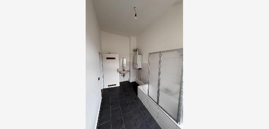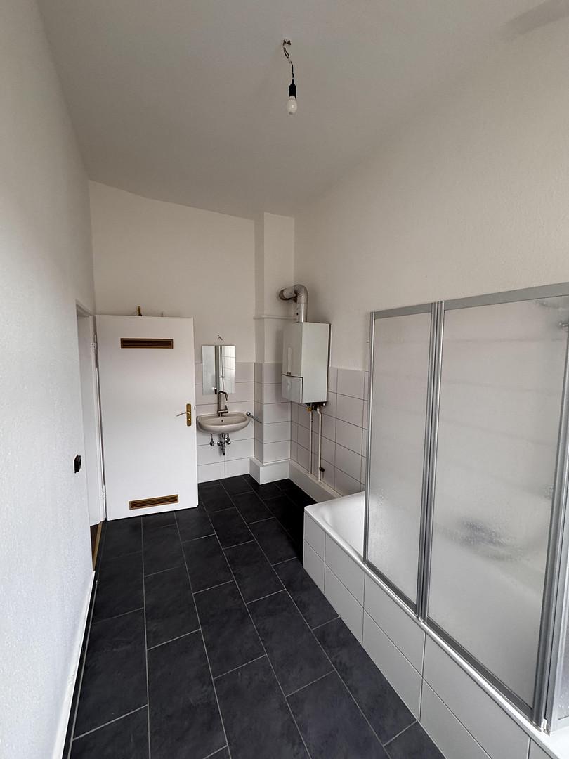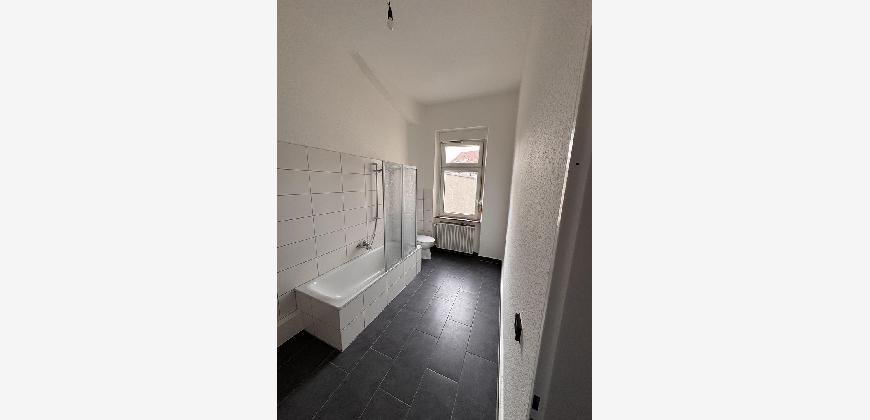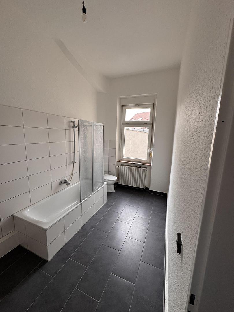 Neues Tageslichtbad mit Badewanne, Duschaufsatz und modernen Fliesen