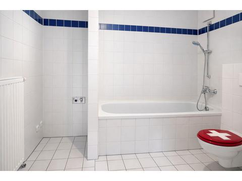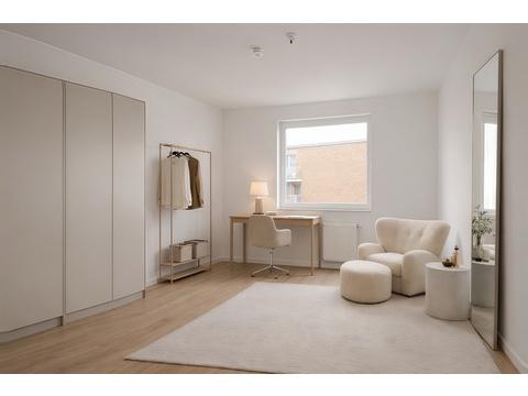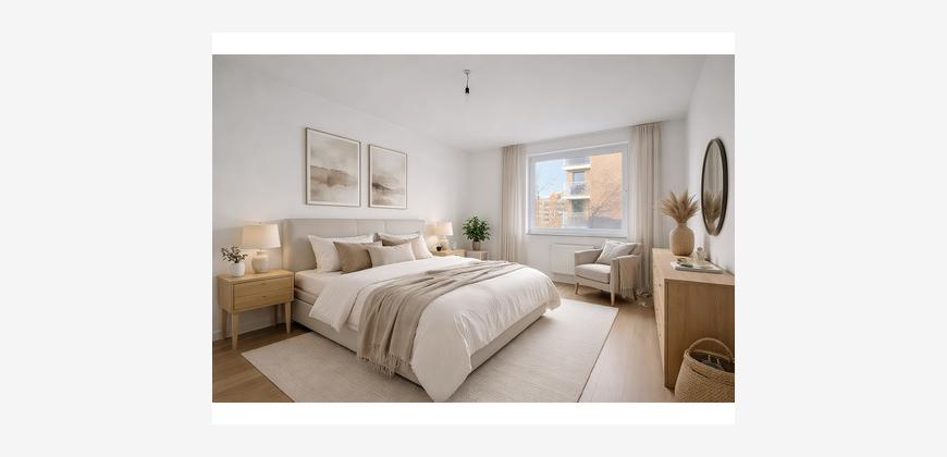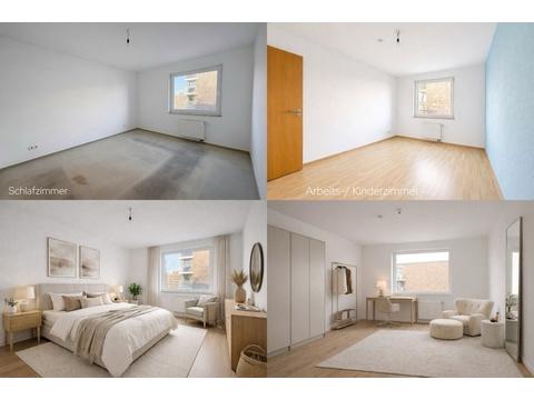 Zwei weitere Zimmer lassen sich flexibel als Schlaf-, Kinder- oder Arbeitszimmer nutzen und bieten Blick in die begrünte Umgebung. Das geflieste Badezimmer ist zeitlos gestaltet und mit einer Badewanne sowie einem Waschmaschinenanschluss ausgestattet. Ein separater Abstellbereich im Flur ergänzt das Raumangebot sinnvoll.