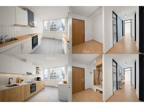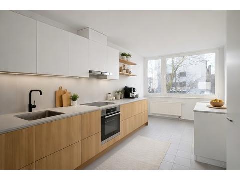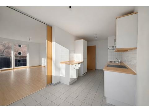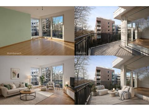 Der Wohnbereich bildet den kommunikativen Mittelpunkt der Wohnung und öffnet sich zum Balkon mit seitlichem Blick auf das Wasser der Rummelsburger Bucht – ein Ort für Ruhe, Ausgleich und besondere Momente im Alltag. Die angrenzende Küche ist sowohl vom Flur als auch direkt vom Wohnbereich erreichbar und bietet mit ihrem Essplatz, großzügigen Fensterflächen und der praktischen Schiebetür eine gelungene Verbindung von Funktionalität und Wohnkomfort.