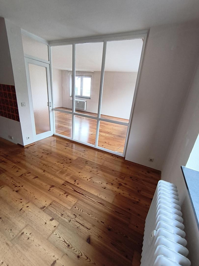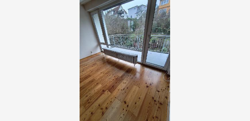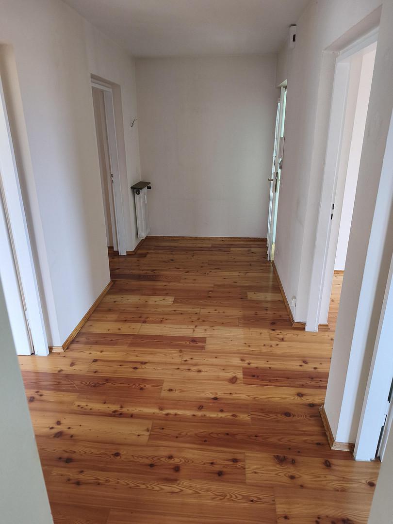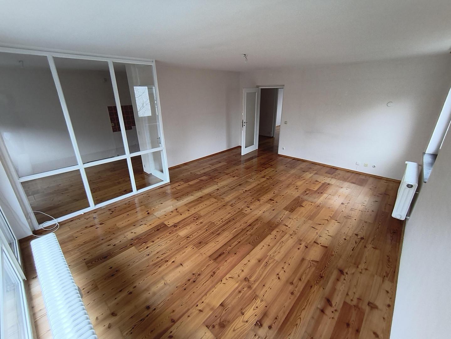 fußwarmer Eichenparkettboden raumübergreifend, Neues Bad mit Walk-in Dusche und zeitgemäßes Design bis zur Neuvermietung, Wohnung wird weiß gestrichen übergeben.