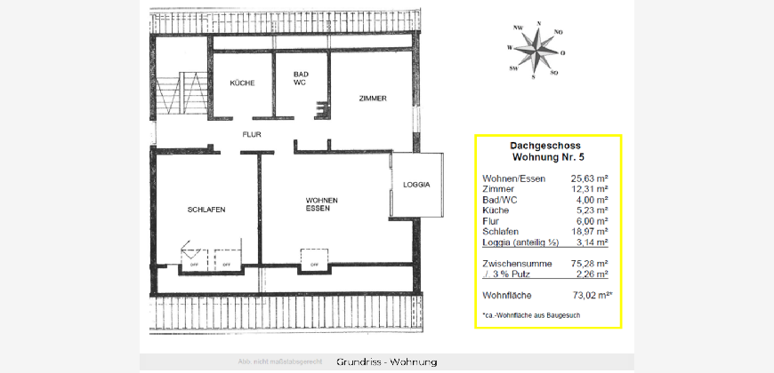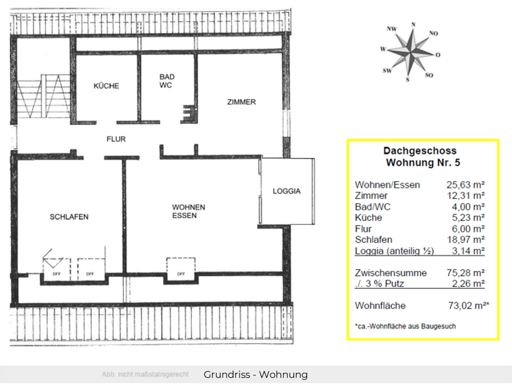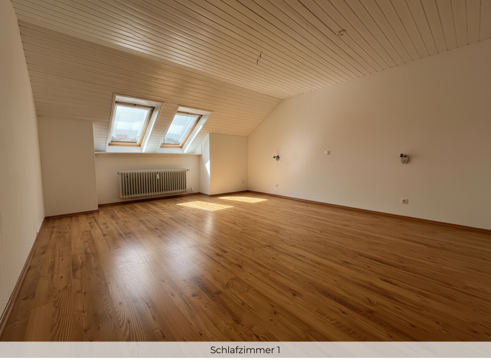 Diese lichtdurchflutete 3-Zimmer-Dachgeschosswohnung (73 m²) in einem hausmeisterbetreuten Mehrfamilienhaus mit nur 6 Wohneinheiten bietet Ihnen ein gemütliches Zuhause mit durchdachter Raumaufteilung. Das großzügige Wohn-/Esszimmer (ca. 26 m²) hat direkten Zugang zur nach Osten ausgerichteten Loggia mit schönem Blick ins Grüne – der perfekte Ort zum Entspannen. Ein komfortables Schlafzimmer (ca. 19 m²), ein weiteres flexibel nutzbares Zimmer (ca. 12 m² – ideal als Homeoffice oder Gästezimmer) sowie ein helles Badezimmer mit Fenster runden das Angebot ab. Die Wohnung befindet sich in gepflegtem Zustand und ist sofort bezugsfrei. Ideal für Paare, Singles oder als Kapitalanlage. Monatliches Hausgeld: 478 € inkl. Heiz- und Wasserkosten. Die WEG verfügt über eine solide Gesamtrücklage von 113.000 €.