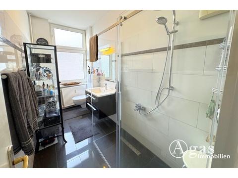 Das Badezimmer ist mit einer verglasten, bodentiefen Dusche ausgestattet und verfügt über Tageslicht. Die Küche ist vollständig eingerichtet und lässt keine Wünsche offen.