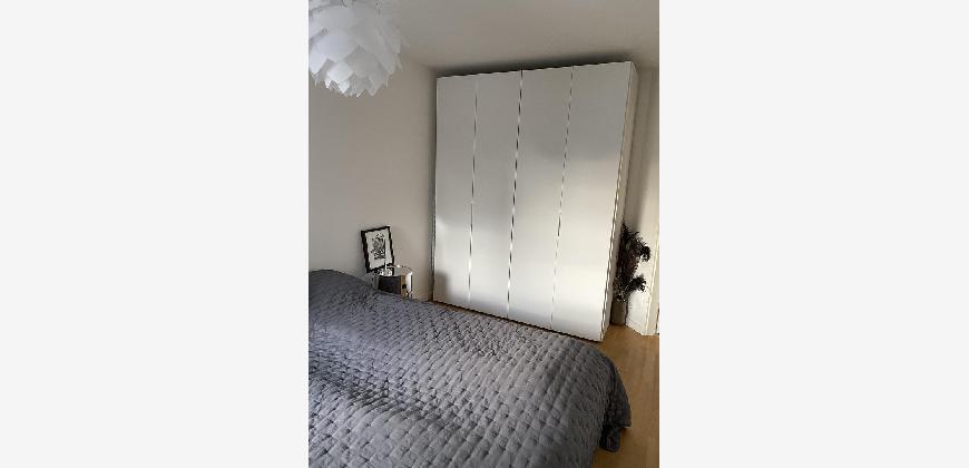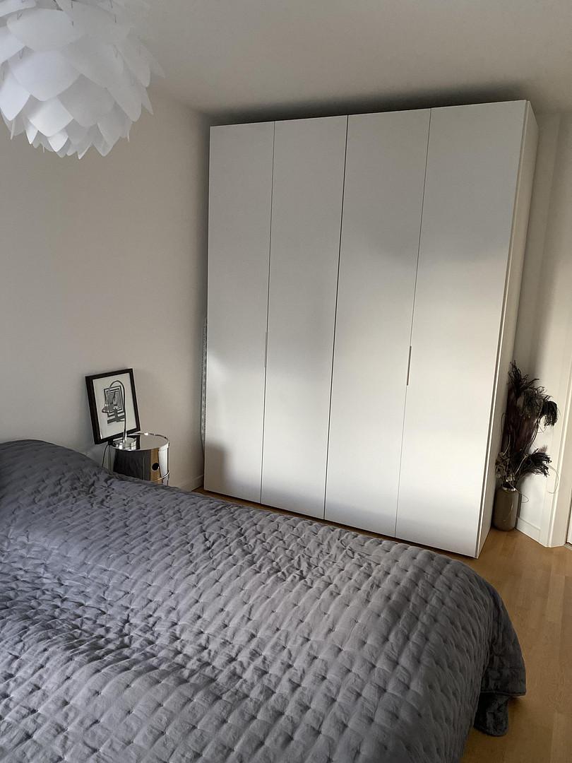 Das Schlafzimmer mit Doppelbett, Nachttischen und Kleiderschrank.