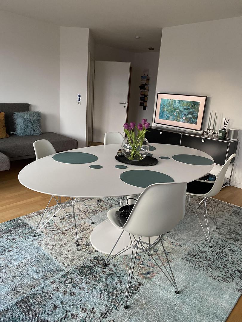 Wohn- / Esszimmer ausgestattet mit Esstisch und Stühle, Kommode, Couch, Teppich, Gardinen, Fernseher.