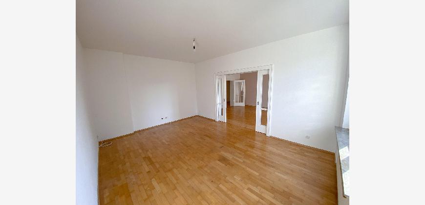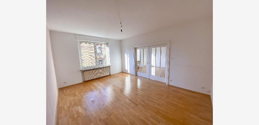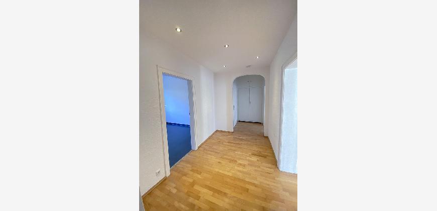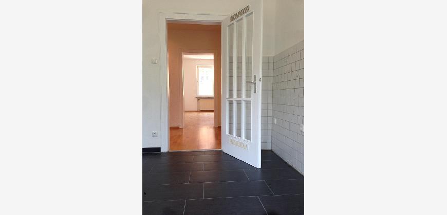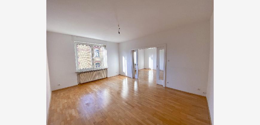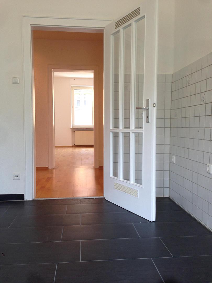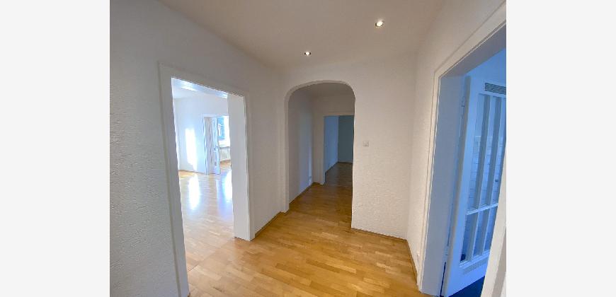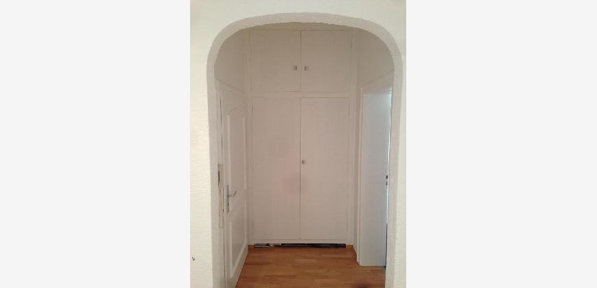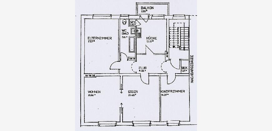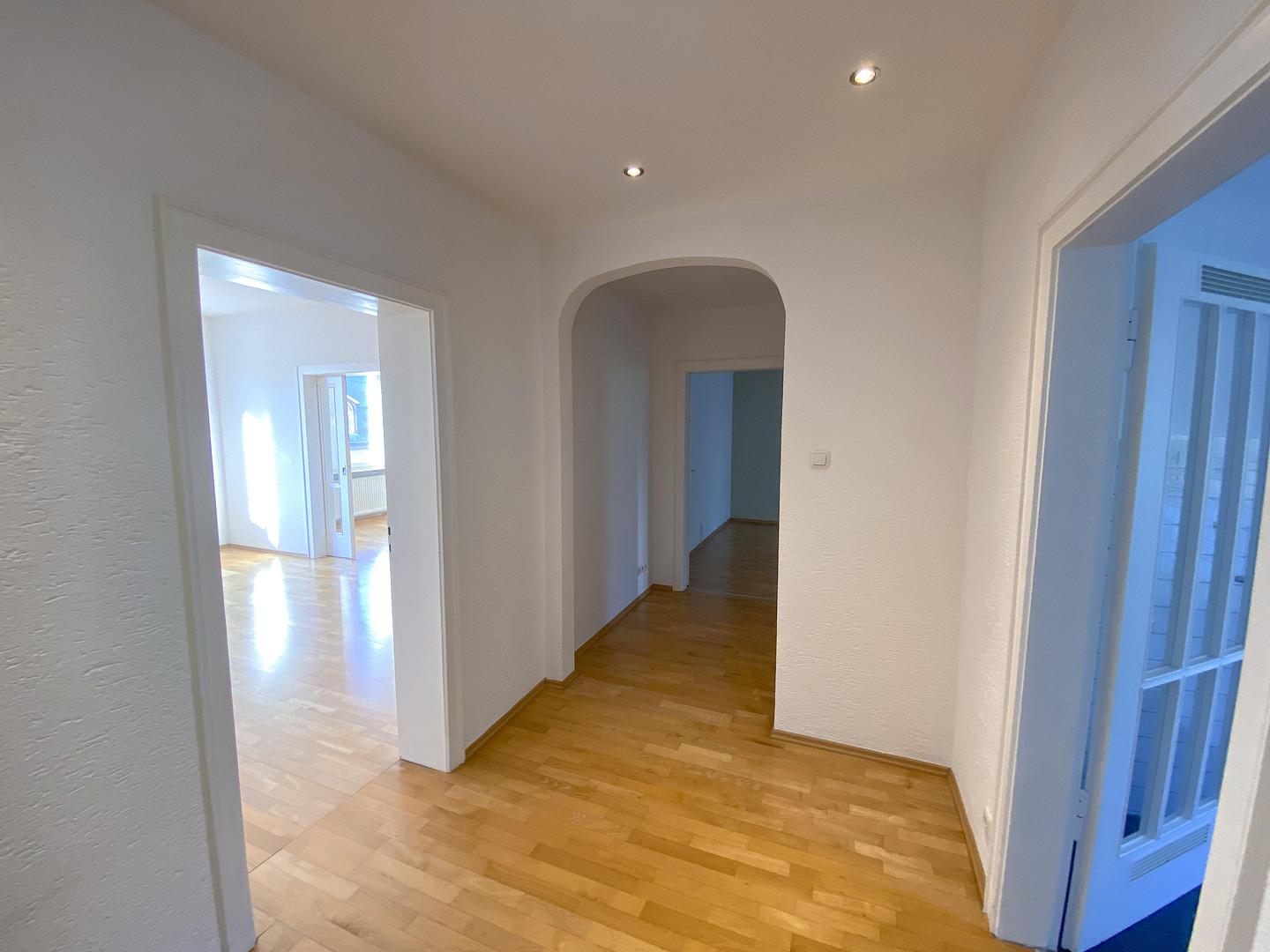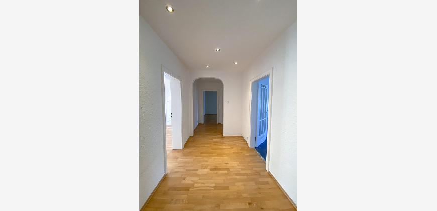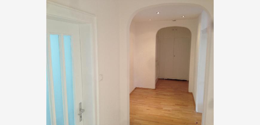 Grosszügige Wohnung mit schöner Aufteilung - durch eine Glas-/Holzschiebetür sind Ess- und Wohnzimmer (je 20 qm) miteinander verbunden. Hochwertiges Parkett in Diele, Ess- und Wohnzimmer. Hochwertiger Fliessenboden in Küche. Raumhöhe ca. 2,83 m, eingebauter Wandschrank in Diele, auch als Garderobe nutzbar, Vorratsraum in Küche, zusätzliche Nutzfläche im separaten Kellerraum, Balkon zum Garten.