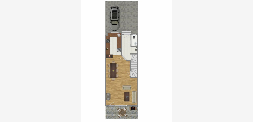 Nach Betreten des Gebäudes befindet sich links das Gäste-WC und im Anschluss die Garderobe. Folgen Sie der Diele weiter so gelangen Sie in den großen Wohn-Essbereich mit angrenzender, offen gestalteter Küche (inkl. Einbaumöbel und Markengeräten). Ebenfalls können Sie vom Wohnbereich aus Ihre Terrasse und den kleinen Garten betreten, welcher mit einem Gartenhäuschen ausgestattet ist. Über ein Gartentor kann man den Garten zudem betreten oder verlassen. Die Terrasse verfügt über eine Markise.
