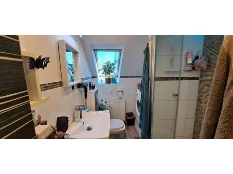 Ausstattunggefliestes Bad mit Dusche und Fenster,