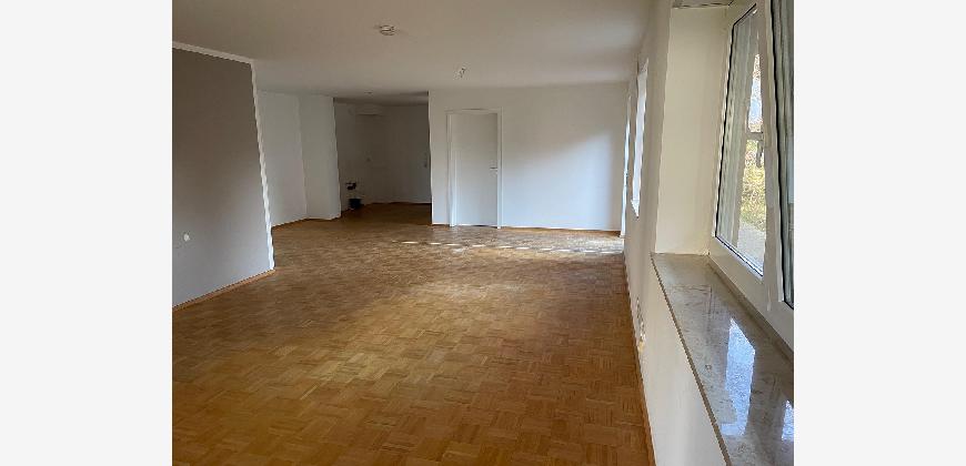 Räumlichkeiten Wohnen, Schlafen und Küche/Essen mit Echtholz-Mosaik-Parkett und Fußbodenheizung. Tageslichtbad mit Bodenfliesen und Fußbodenheizung.