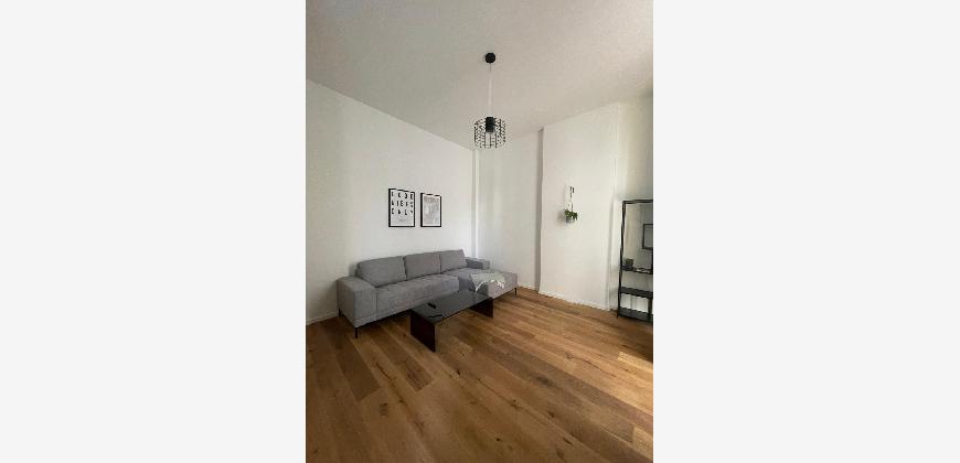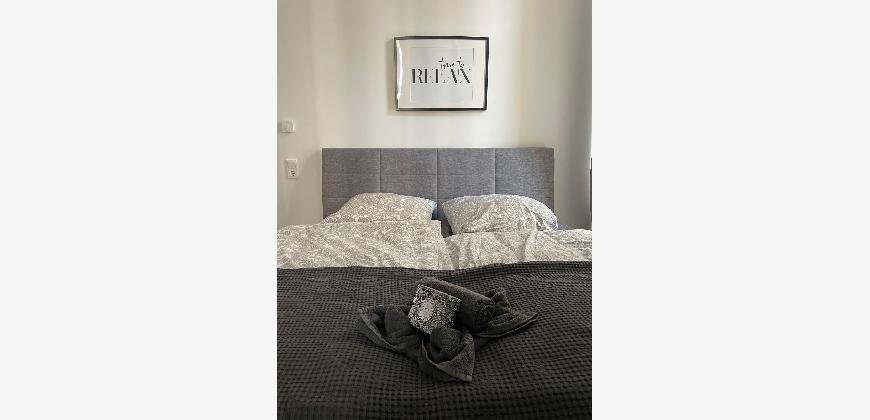 Das innenliegende Badezimmer ist mit modernen grauen Fliesen ausgestattet und fügt sich harmonisch in das Gesamtbild der Wohnung ein. Der Balkon, der direkt vom Wohnbereich aus zugänglich ist, erweitert den Wohnraum nach außen und bietet zusätzlichen Komfort.