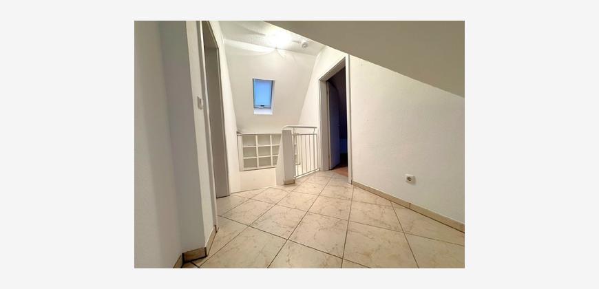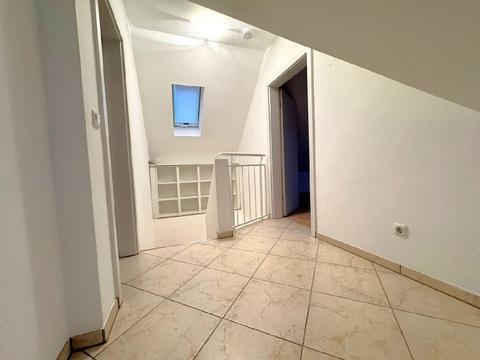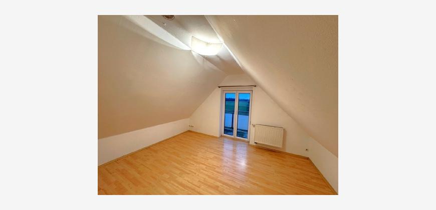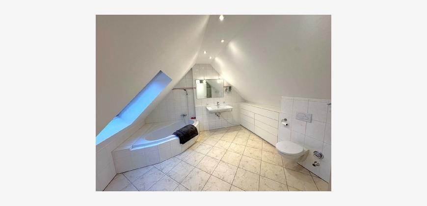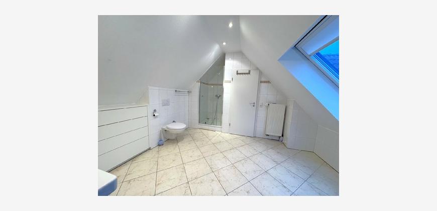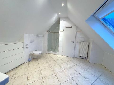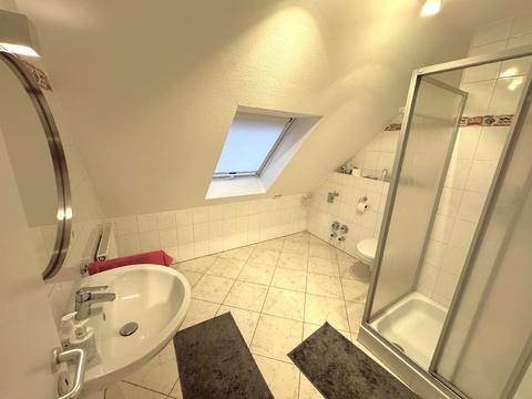 Über eine massive Beton-Treppe erreichen Sie das Dachgeschoss mit zwei weiteren Schlafzimmern und einem großzügigen Tageslichtbad mit Wanne und Dusche. Die Dachfenster der Wohnung lassen viel Licht in die Räume und nachträglich eingebaute Rollläden sorgen im Sommer und im Winter für ein angenehmes Raumklima.