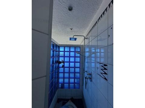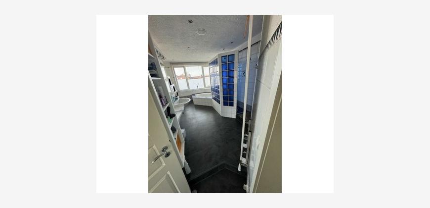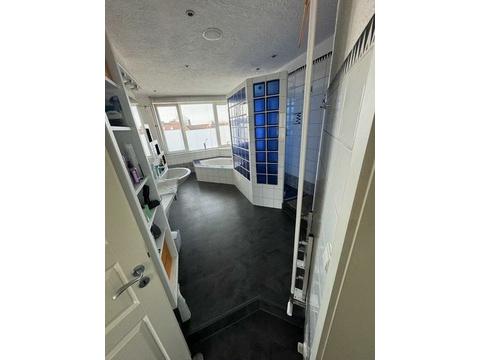Geradeaus vom Eingangsbereich aus liegt der Zugang zur Hauptwohnung. Beim Betreten öffnet sich hier ein großzügiger Loftbereich. Auf der rechten Seite befindet sich das Badezimmer, ergänzt durch einen separaten Heizungsraum mit Waschmaschinenanschluss. Das Badezimmer ist mit einer barrierefreien Dusche, einer Eckbadewanne, WC, Bidet, Hygienebereich sowie einem Fenster ausgestattet.