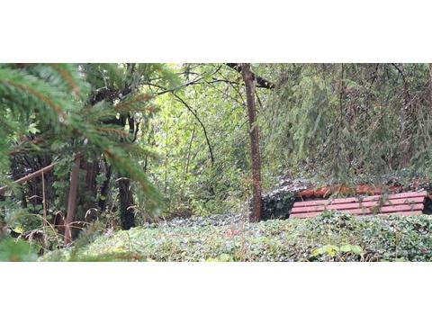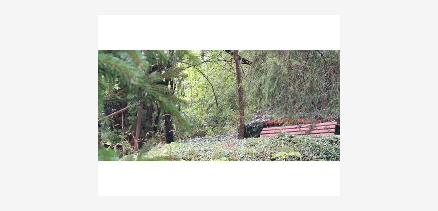 Auch im erhöhten kleinen idyllischen Gartenwäldchen mit einer Gartenbank deutet an,