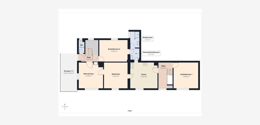 Herzstück des Hauses ist die große, lichtdurchflutete und voll ausgestattete Küche, ergänzt durch ein separates Esszimmer sowie ein gemütliches Wohnzimmer. Ein Badezimmer und zwei separate WCs sorgen für hohen Wohnkomfort.