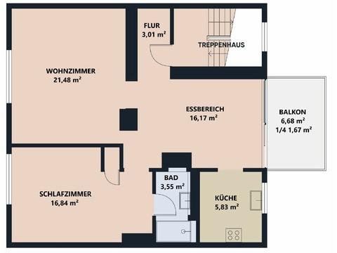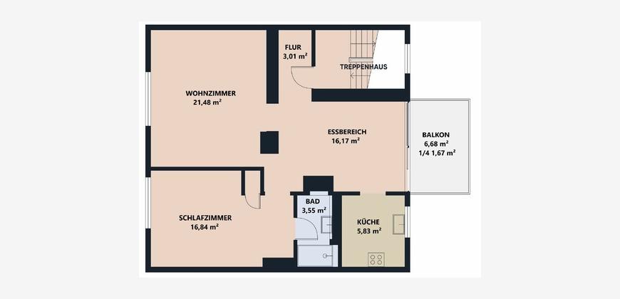 Der Eingangsbereich geht fließend in den großzügigen Wohn- und Essbereich über, der durch seine offene Gestaltung und die loftartige Bauweise ein besonders angenehmes Raumgefühl vermittelt. Große Fensterflächen sorgen für viel Tageslicht und schaffen eine helle, freundliche Atmosphäre. Der Wohnbereich bietet ausreichend Platz für eine gemütliche Sofalandschaft. Ein schöner Essbereich, der zum Verweilen mit Familie und Freunden einlädt, lässt sich direkt vor der Küche und vor dem sonnigen Balkon platzieren.