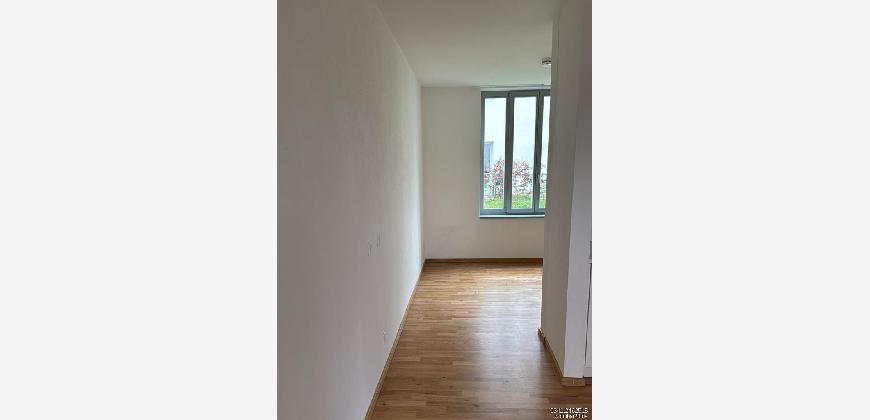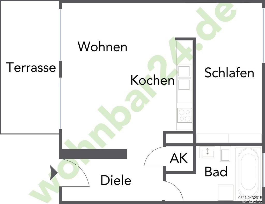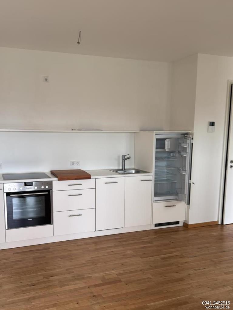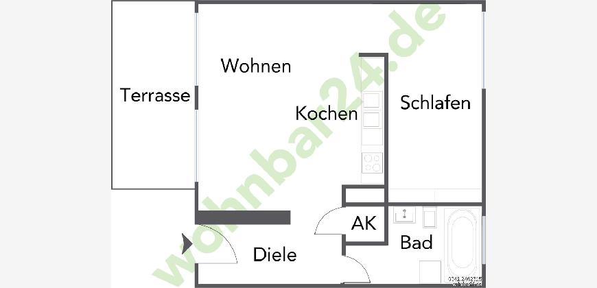 ein Schlafraum mit Einbauschränken und offenem Zugang zum Wohnzimmer, offene Küche mit Einbauküche, Tageslichtbad mit Wanne und WM-Anschluß , Terrasse, Wände gespachtelt und gestrichen, Parkett, Abstellkammer in der Wohnung, Kabel- & Telefonanschluss in allen Räumen, Kellerabteil, Fahrradraum, Zentralheizung (Fernwärme), 1 Stellplatz für 20 EUR zzgl.