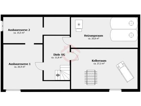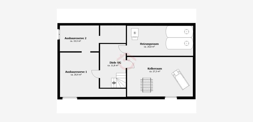 - Untergeschoss: Großer Kellerraum (ideal als Arbeitszimmer oder Hobbyraum nutzbar) sowie weitere Nutzfläche.
