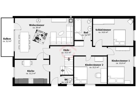 Der Grundriss auf dieser Ebene ist klassisch und familienfreundlich gestaltet: Neben dem Wohnbereich stehen Ihnen drei vollwertige Schlafzimmer zur Verfügung, die sich flexibel als Eltern-, Kinder- oder Gästezimmer nutzen lassen.
