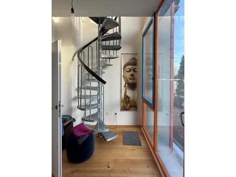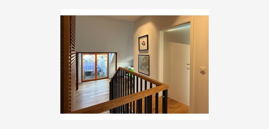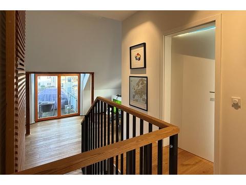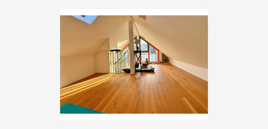Über eine weitere Treppe erreicht man das Dachgeschoss. Hier liegen ein gut geschnittenes Kinder- oder Arbeitszimmer, ein modernisiertes Tageslichtbad mit Walk-in-Dusche sowie das Hauptschlafzimmer mit kleinem Vorraum. Von dort führt ein Zugang in den wohnlich ausgebauten Spitzboden, der vielseitige Nutzungsmöglichkeiten bietet; dieser Bereich ist nicht in der offiziellen Wohnfläche enthalten.