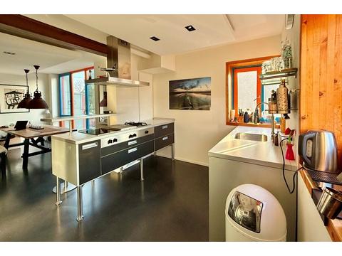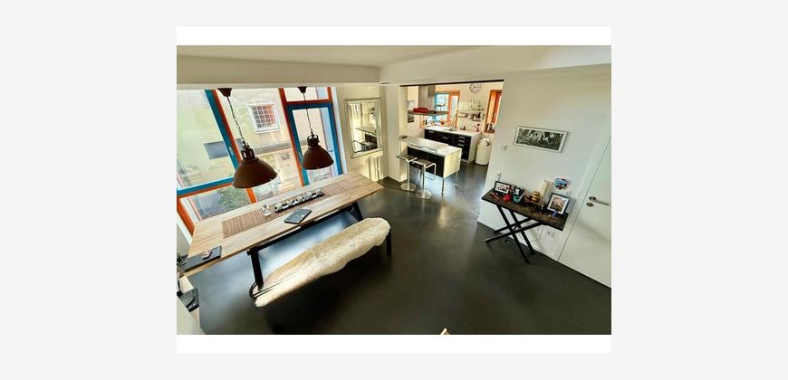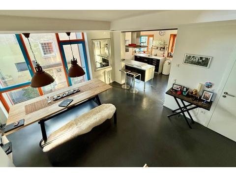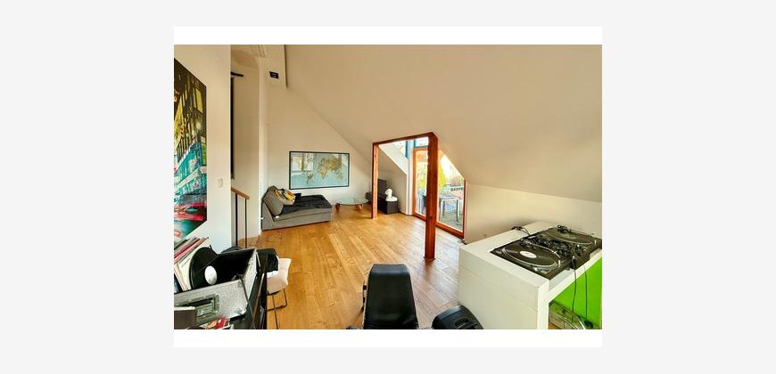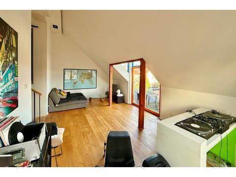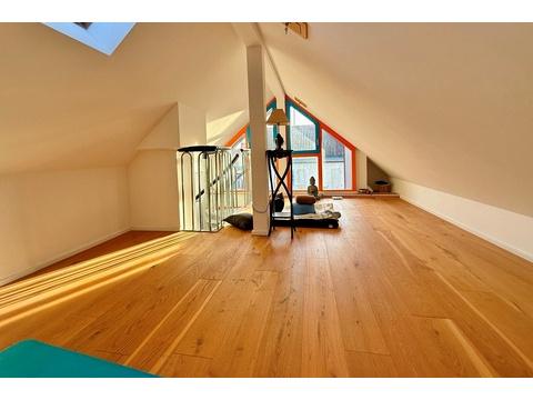Ein halbes Obergeschoss höher öffnet sich das beeindruckende Wohnzimmer mit Deckenhöhen bis in den Giebel. Der Raum vermittelt ein außergewöhnliches Wohngefühl und bietet Zugang zu einem großen Balkon.
