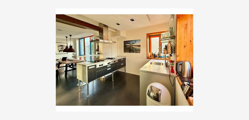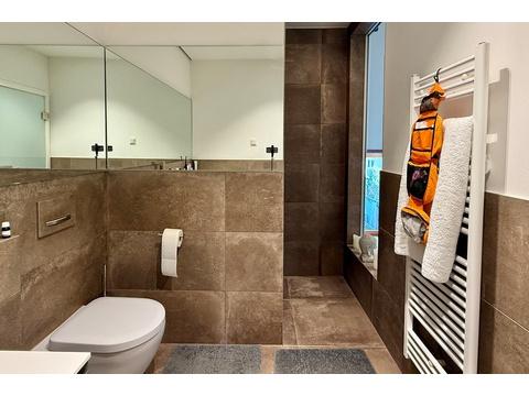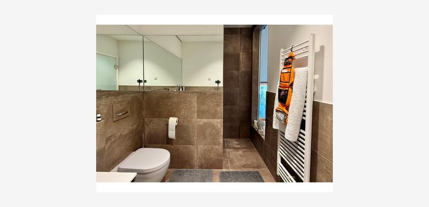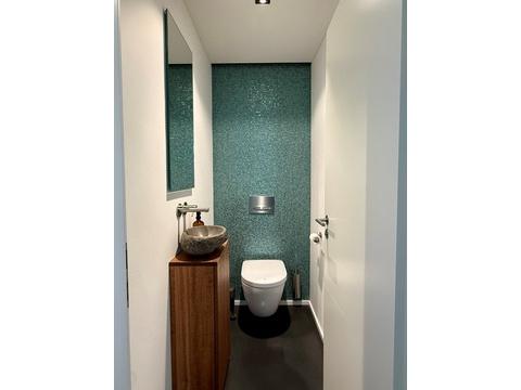 Der Eingang führt in einen weitläufigen Empfangsbereich, der nahtlos in den Essplatz und die hochwertige, offen gestaltete Küche übergeht. Auf dieser Ebenen befinden sich zudem ein Gäste-WC sowie eine praktische Abstellkammer mit Anschluss für Waschmaschine und Trockner.